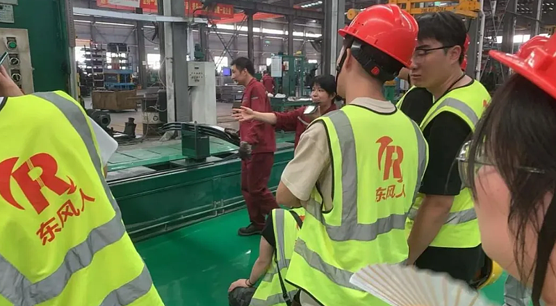 随后,师生一行来到东实(十堰)汽车悬挂系统有限公司,走进生产车间近距离了解板簧制造工艺。工程师现场演示了从钢板下料、加热轧制到淬火喷塑的全流程,重点强调板簧弧度精度对车辆稳定性的影响,并展示了自动化轧机的高效运作。6台全自动设备持续生产的新款变截面板簧,采用少片化设计,在减轻重量的同时提升车辆平稳性,令学生们对传统制造与机器人技术结合有了更深入认识。