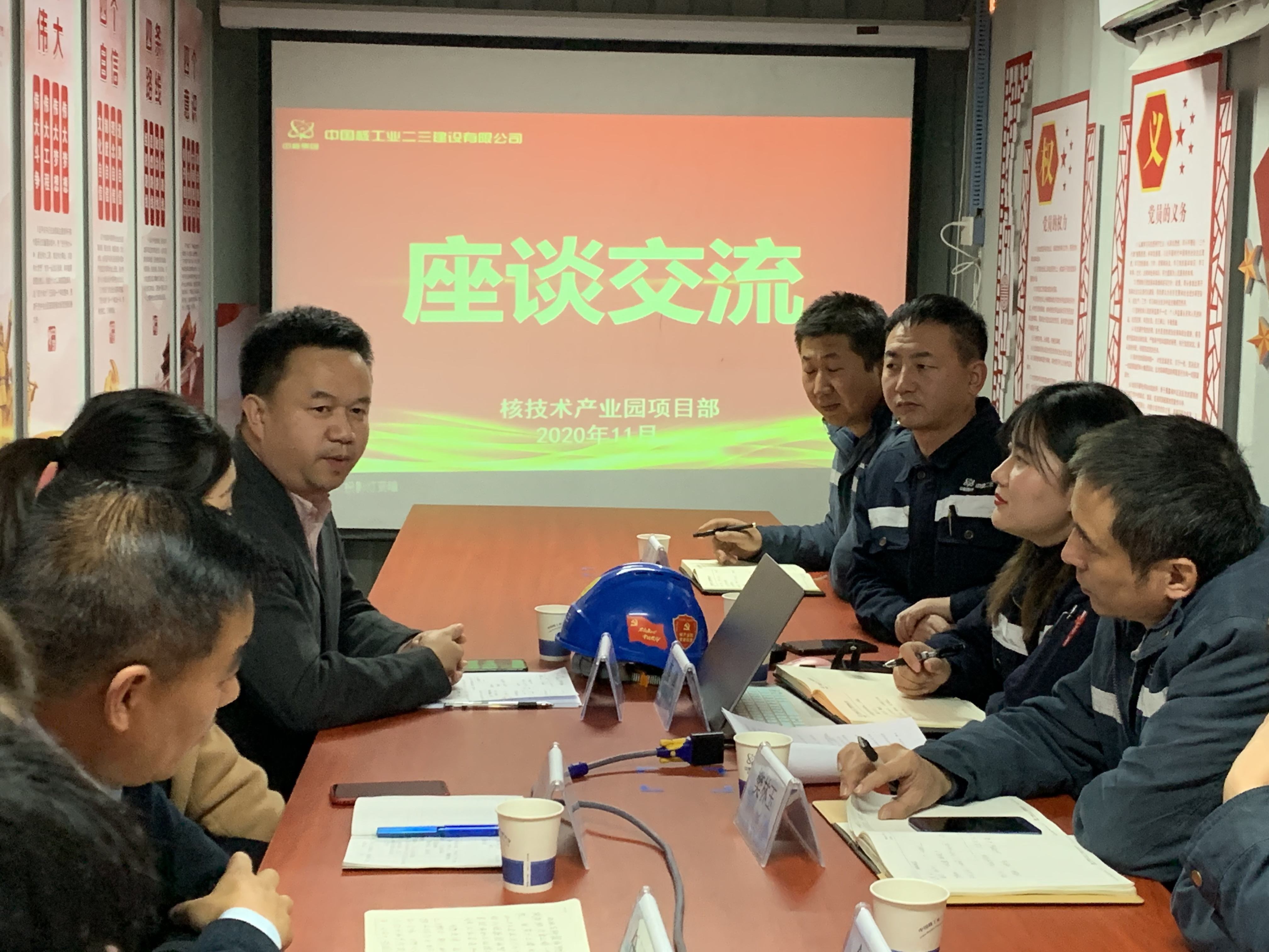 在工作现场集装箱会议室,中核二三建设有限公司甘肃核技术产业园项目部人力资源部经理蔡蓉向与会人员介绍了中核甘肃核技术产业园概况,她指出:甘肃核技术产业园作为现代化核工业高科技产业园区,是甘肃省和中核集团共建的国家项目,是核能循环发展的需要,是反哺和促进甘肃经济发展的产业实体,人才缺口巨大,她从岗位需求、人才规格、员工职业发展通道、新员工(IDP)训练计划、福利体系、薪酬体系等几个方面阐述了人才招聘和培养计划。
