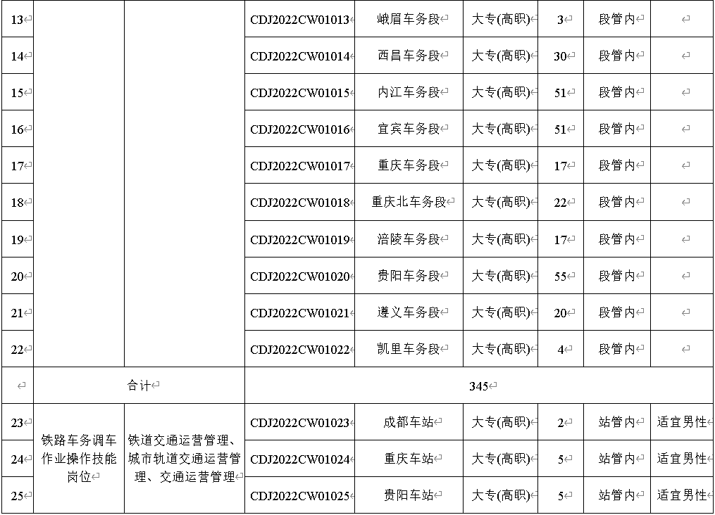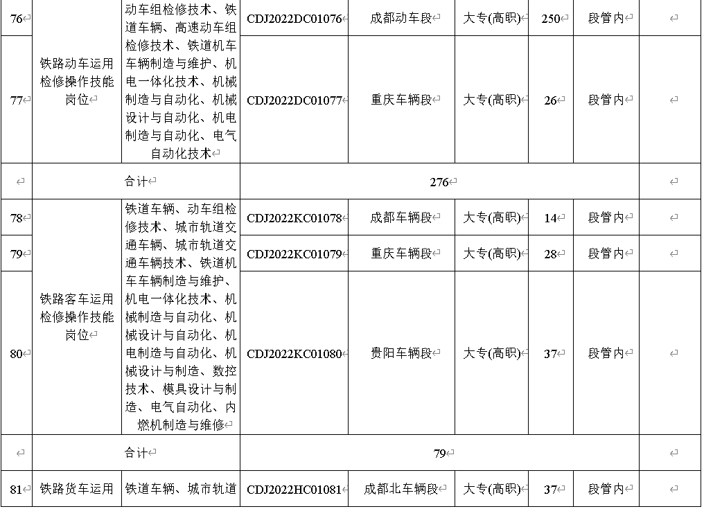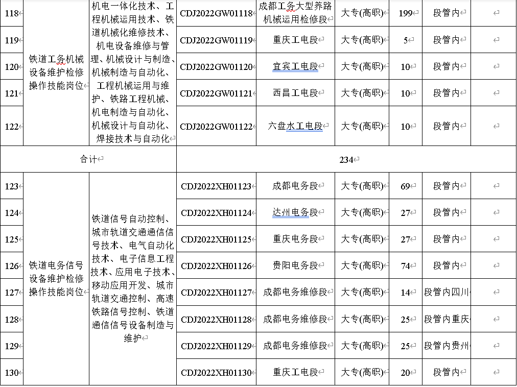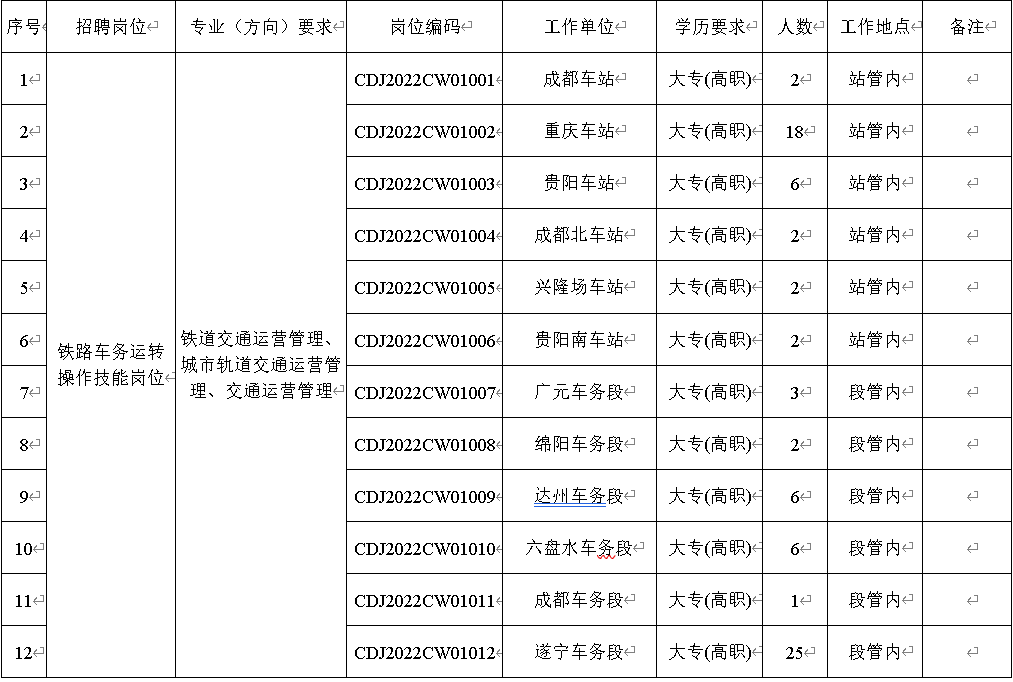 本次计划招聘6006人,招聘岗位均为铁路运输生产一线操作技能岗位。招聘岗位、专业、工作地点及人数等内容详见一《中国铁路成都局集团有限公司2022年度招聘高校毕业生岗位信息表》