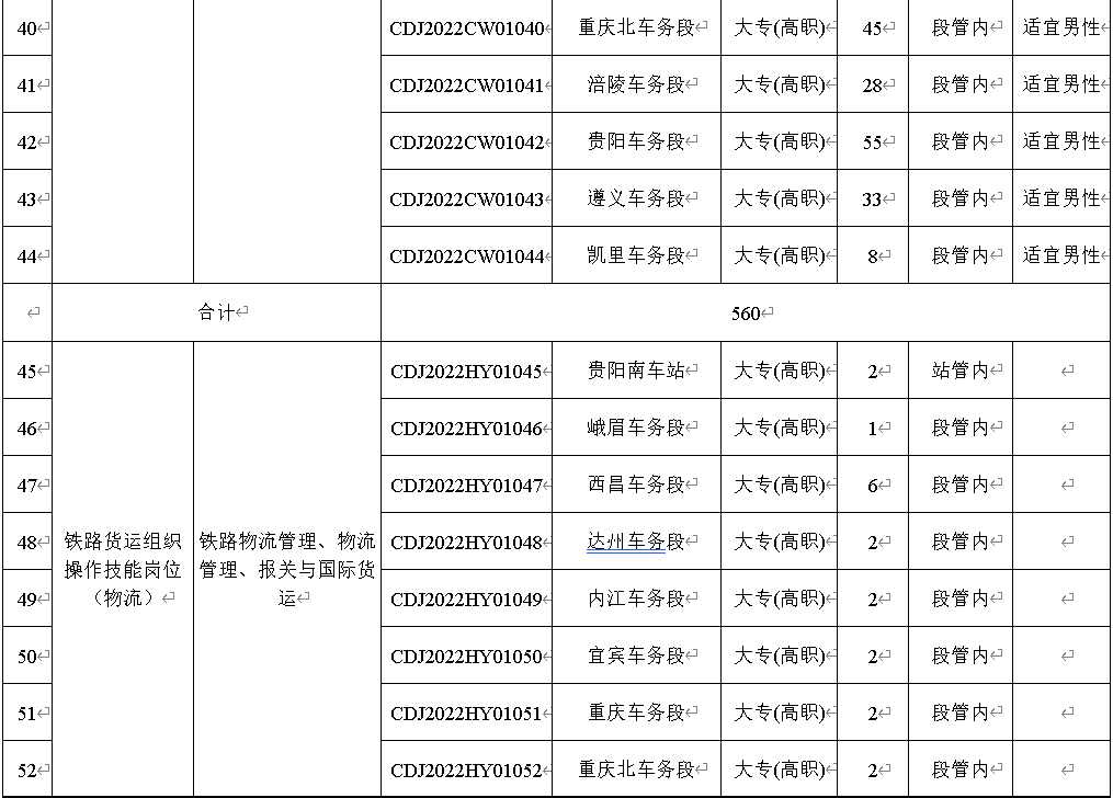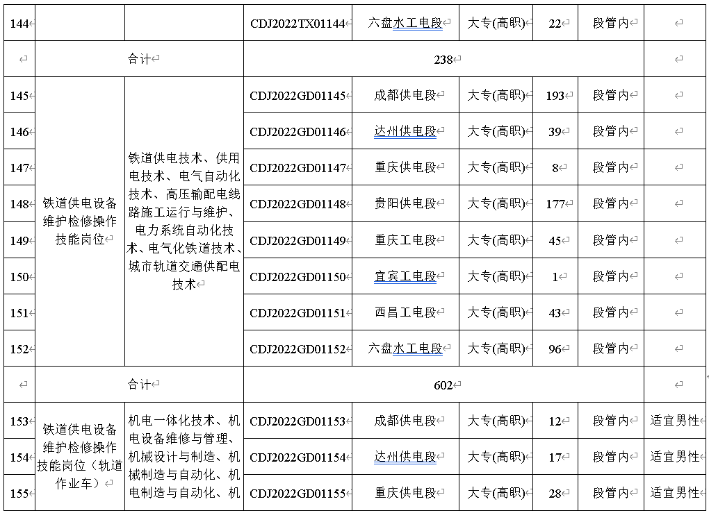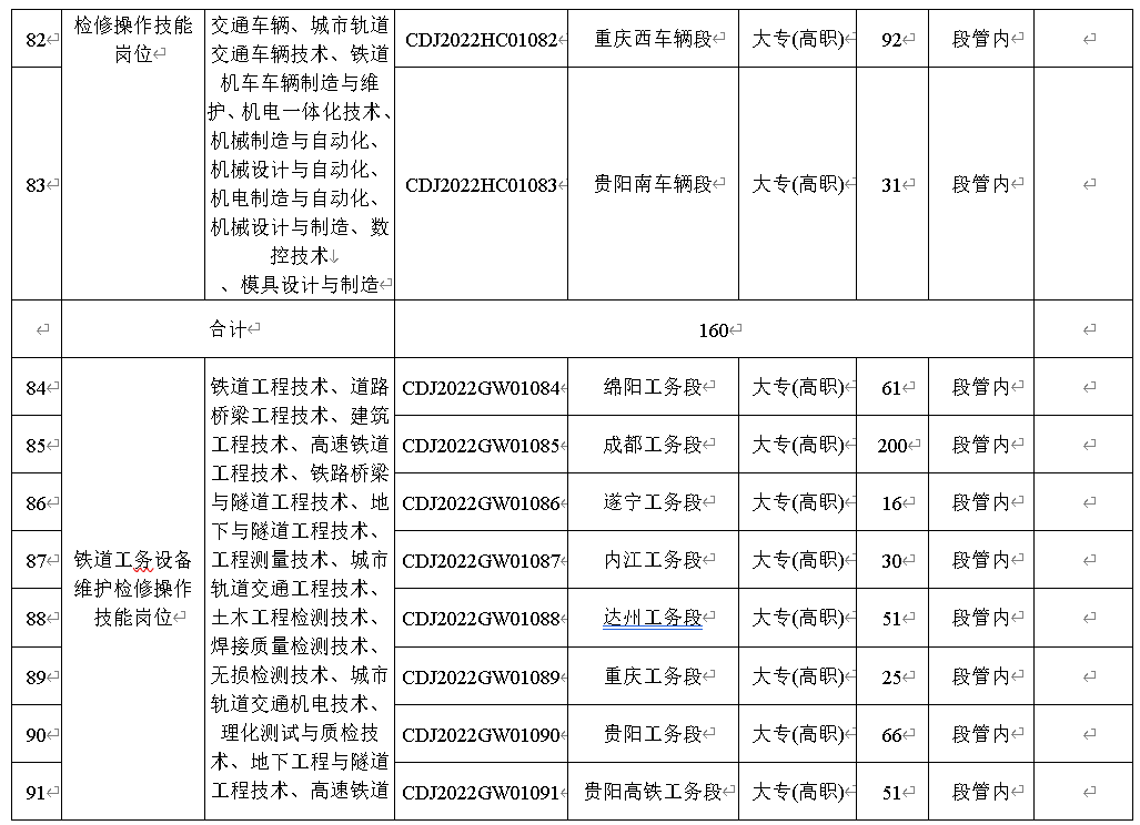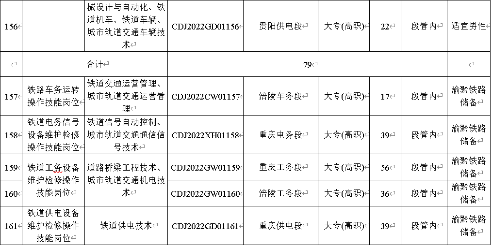 4.应聘者户籍所在地为重庆市酉阳、秀山、黔江、彭水、武隆、石柱六区县的2022届铁路主专业定向毕业生,可以报考岗位编码CDJ2022CW01157、CDJ2022XH01158、CDJ2022GD01159、CDJ2022GD01160、CDJ2022GW01161为渝黔铁路储备人员岗位。(详见附件一)