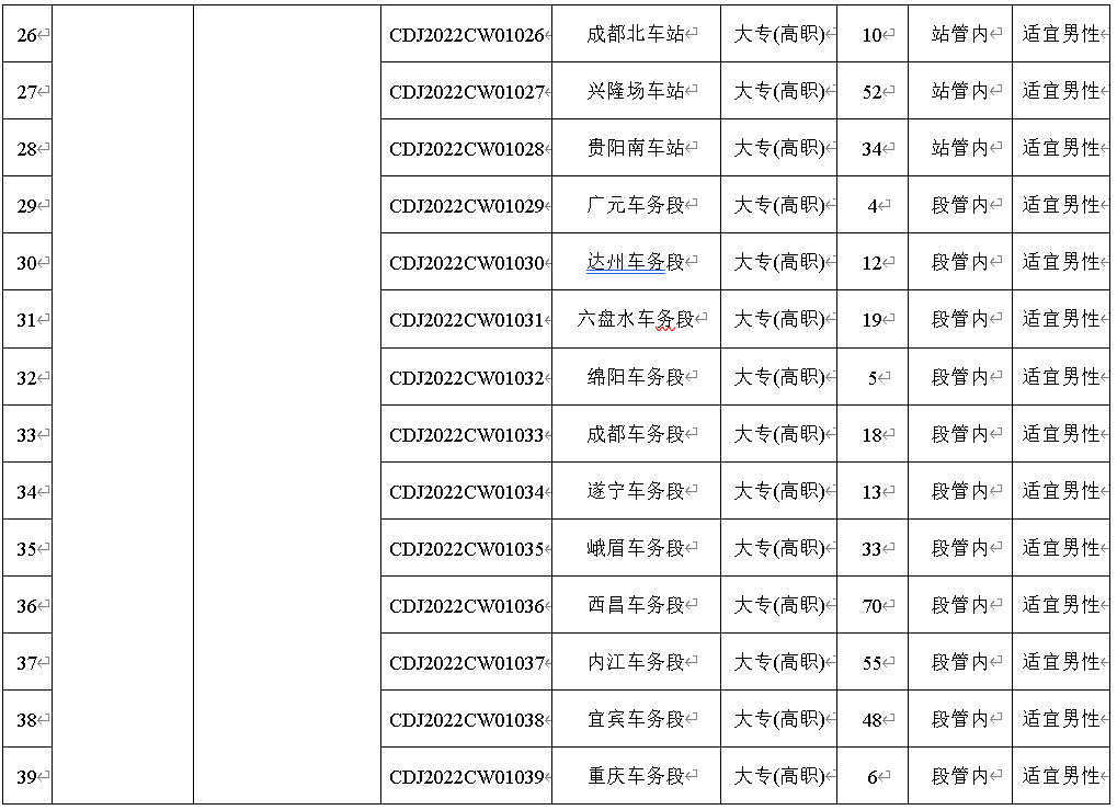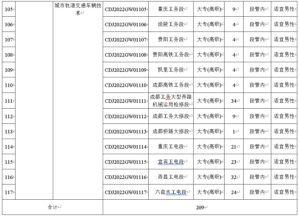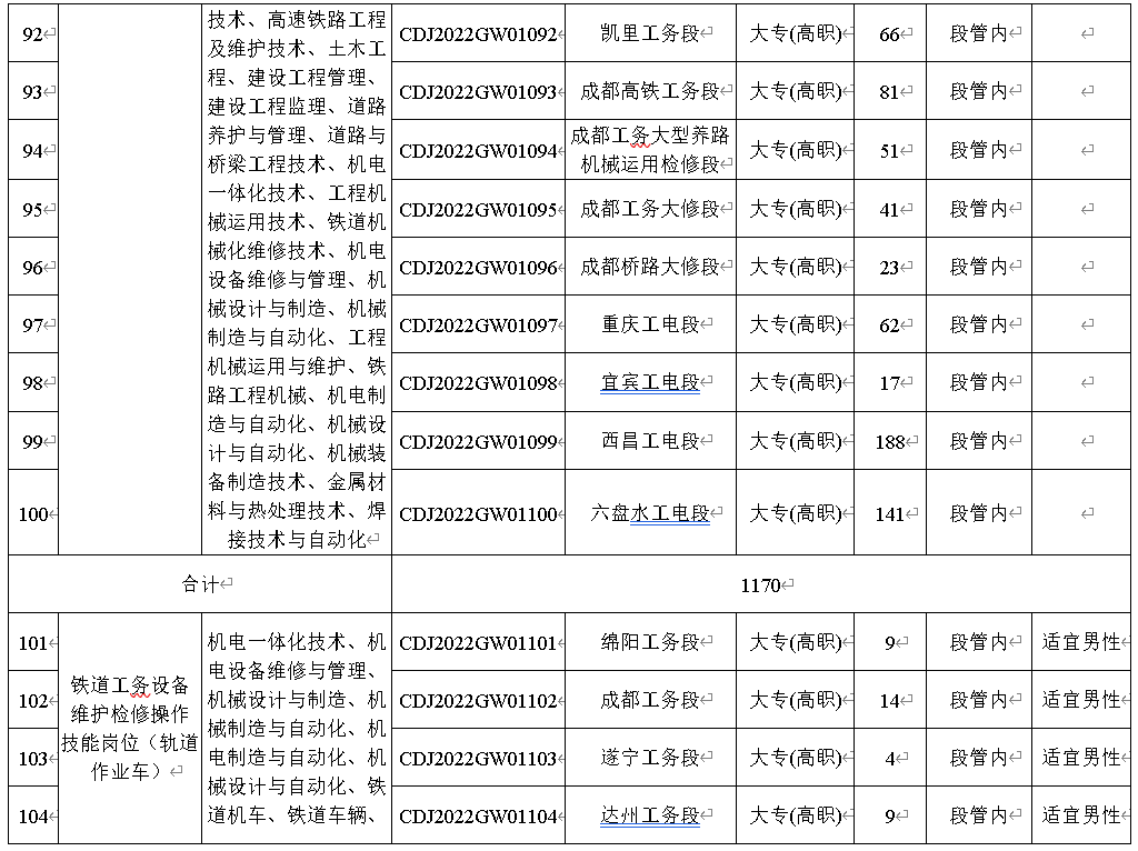 3.应聘者必须符合招聘岗位要求的学历、专业等条件。其中岗位编码CDJ2022CW01001至CDJ2022GD01156,要求所学专业是铁路专业方向或所学课程包含铁路专业课程。(详见附件一)