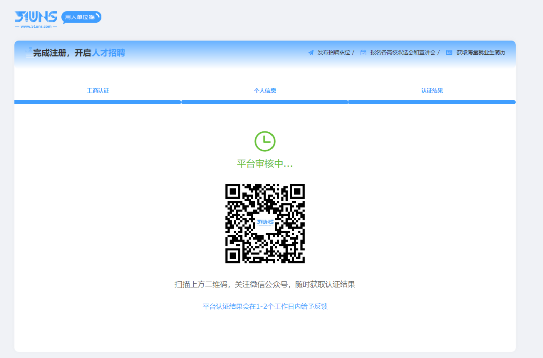 第3步:企业登录/注册招聘服务平台。在注册报名时,需上传资质、营业执照等信息请提前准备。单位提交的工商认证及个人信息需由平台审核,审核时间为自用户提交认证信息后1-2个工作日。