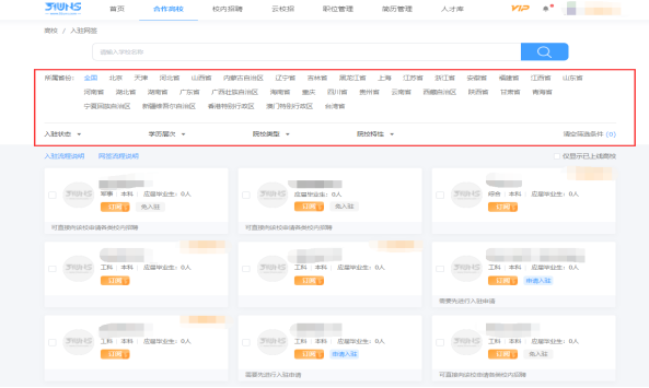 单位可通过筛选条件进行高校的筛选或通过搜索框进行检索,找到我校。如图所示;