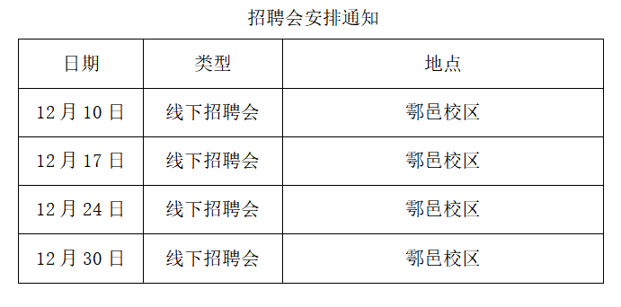衷心感谢广大用人单位长期以来对我校就业工作的关心与支持。为进一步做好我校2022届毕业生就业工作,学校将于2021年12月举办4场线下综合类招聘会,诚邀贵单位参加。