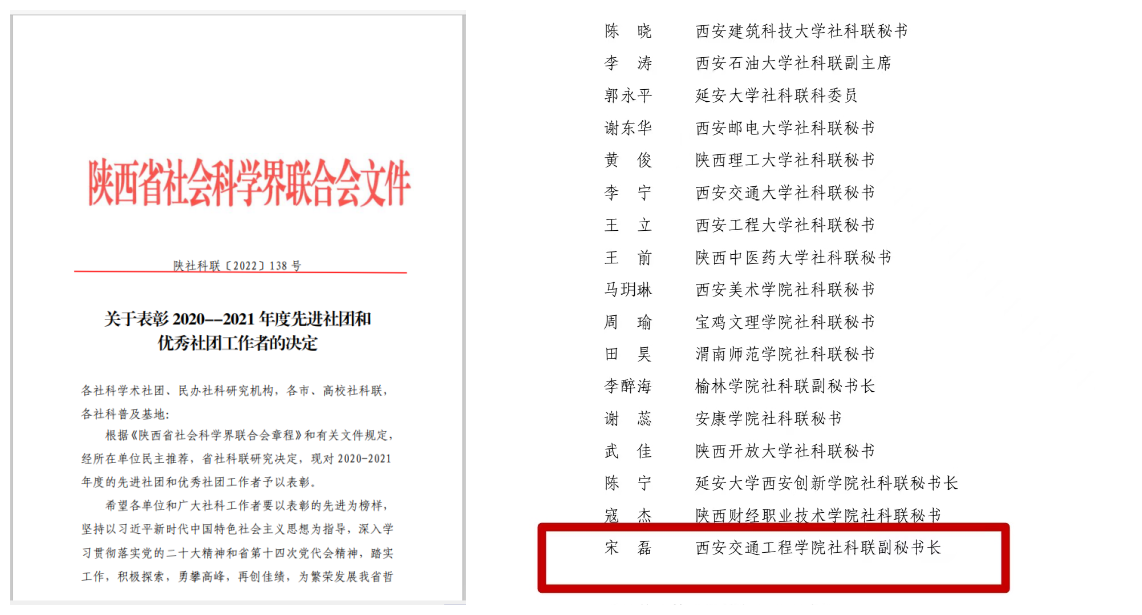 近日,陕西省社科联发布《关于表彰2020-2021年度先进社团和优秀社团工作者的决定》,对2020-2021年度先进社团和优秀社团工作者予以表彰,我校青年教师宋磊获得“2020-2021年度优秀社团工作者”荣誉称号。市、高校共有25人获的表彰。