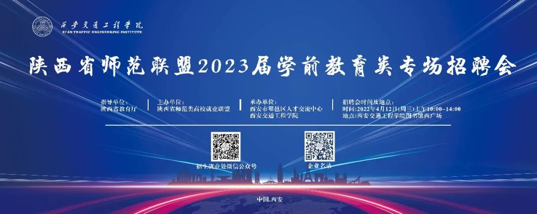 为贯彻落实党中央、国务院关于“稳就业”“保就业”工作重要决策部署,积极搭建用人单位与毕业生方便、高效、精准的就业服务双选平台,为企业提供优质的人力支持和人才服务,切实促进我校2023届毕业生更充分更高质量就业。经研究决定,我校将于2023年4月12日(周三)举办陕西省师范联盟2023届学前教育类专场招聘会暨西安交通工程学院综合类线下双选会,诚挚邀请贵单位前来我校选聘优秀毕业生。现将相关事宜函告如下: