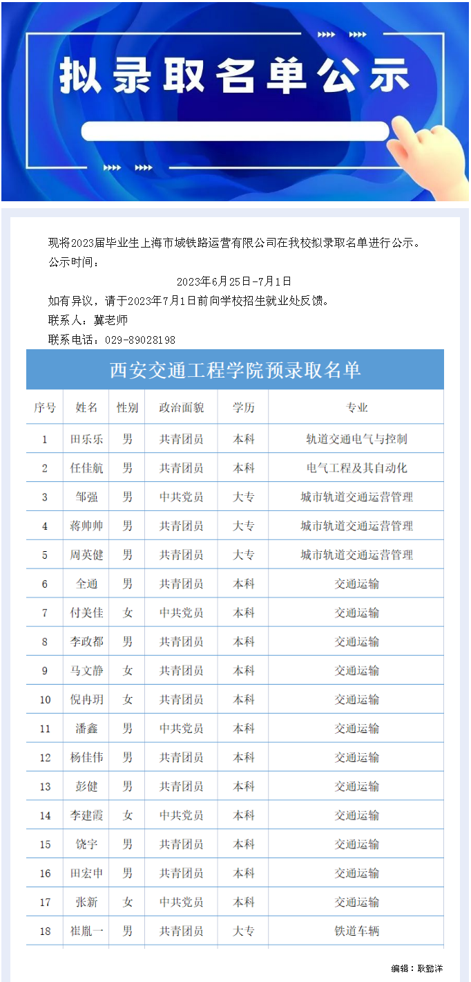 拟录取‖2023届毕业生上海市域铁路运营有限公司拟录取名单