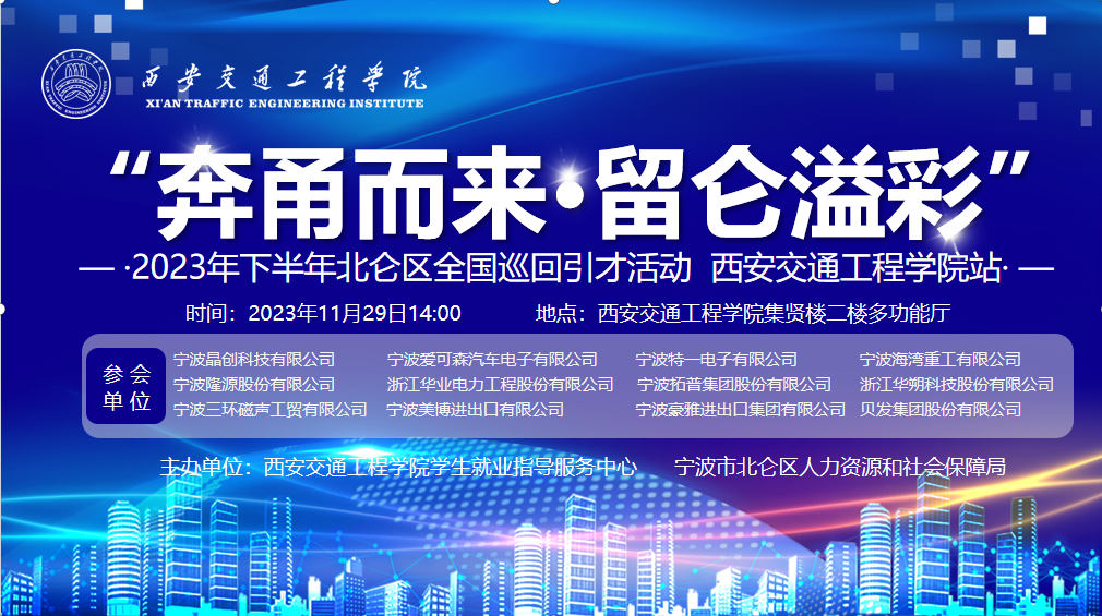 为深入贯彻落实党中央、国务院“稳就业”“保就业”决策部署,坚定不移支持党的二十大“就业优先战略”,11月29日在我校集贤楼二楼报告厅举办“奔甬而来.留仑溢彩”2023年下半年北仓区全国巡回引才活动,由西安交通工程学院学生就业指导服务中心与宁波市北仓区人力资源和社会保障局主办。宁波晶创科技有限公司、宁波爱可森汽车电子有限公司、宁波特一电子有限公司等十余家知名企业、我校相关老师和2024届毕业生参加招聘会。