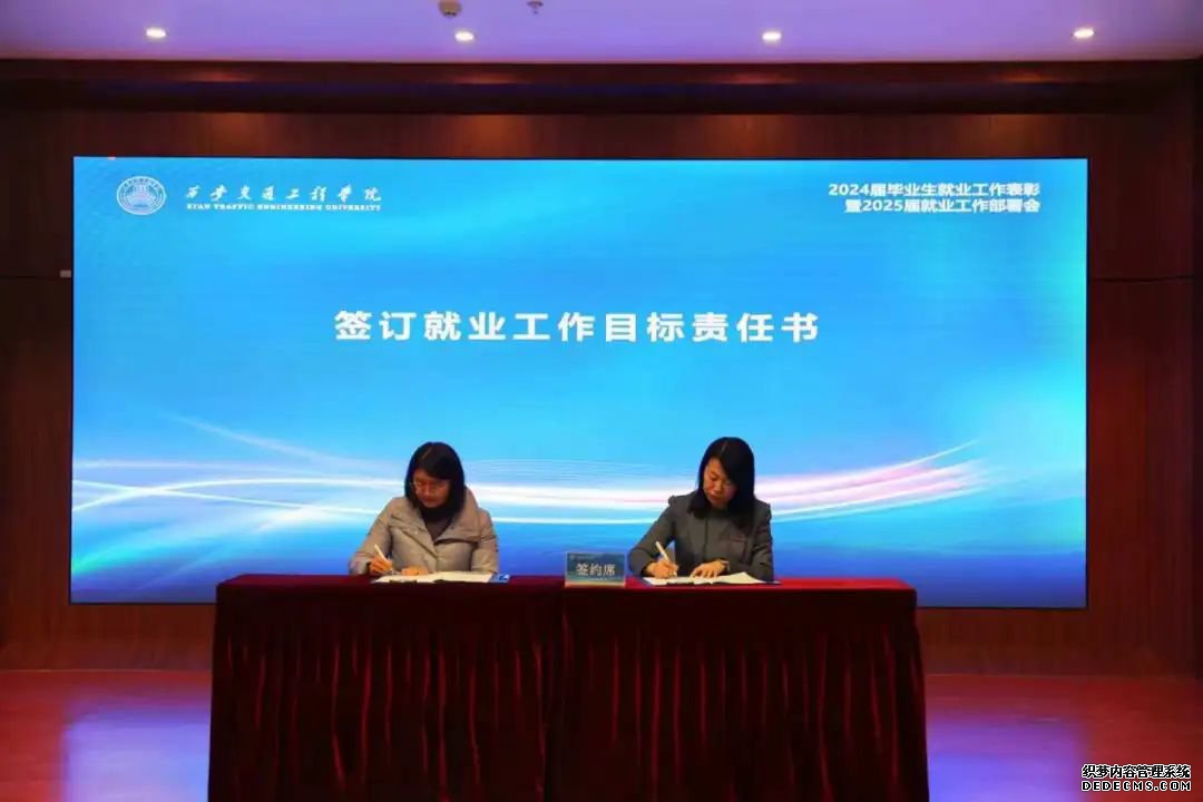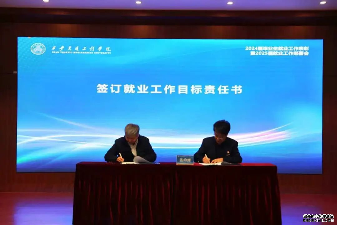 会议进行就业工作目标责任书签订仪式。校长曹庆年、副校长徐炜分别与交通运输学院院长崔炳谋、现代技术学院院长都娟丽签订2025届毕业生就业工作目标责任书,明确了2025年就业工作目标和任务。