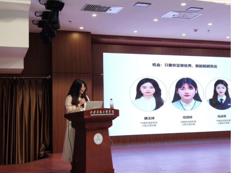 活动特别邀请了往届优秀入职学姐作工作体验分享。学姐结合自身经历,讲述了在慧通商务的成长故事,感谢母校对其悉心培养,鼓励学弟学妹们积极投递简历。企业代表认真收集简历,并对我校学生的积极态度给予肯定。