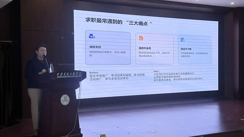 针对学生普遍关心的AI生成内容同质化及如何规避工具使用痕迹等困惑,祁老师重点推荐并现场演示了豆包、deepseek等四款免费AI工具的应用技巧,“AI不能用于经历造假,输出结果仅为草案,最终决策权必须掌握在求职者手中。”祁祎萌老师特别指出。