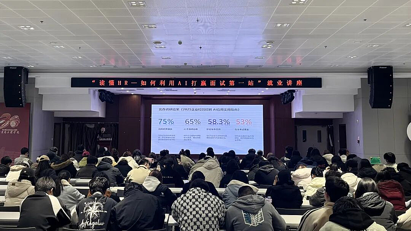 讲座以“读懂HR——如何利用AI打赢面试第一战”为主题,围绕自我认知、职业探索与决策行动三大维度展开深入讲解。祁祎萌老师强调,当前AI技术正在重塑求职生态,近75%的企业采用AI系统对面试者进行简历初筛。