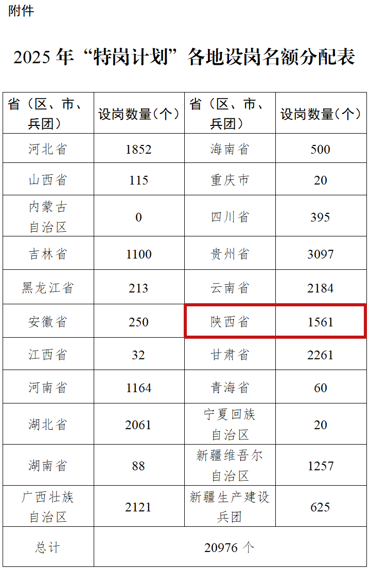 (二)招聘数量。2025年全国计划招聘“特岗计划”教师20976名,各省(区、市)和新疆生产建设兵团的招聘名额见2025年“特岗计划”各地设岗名额分配表(附件)。