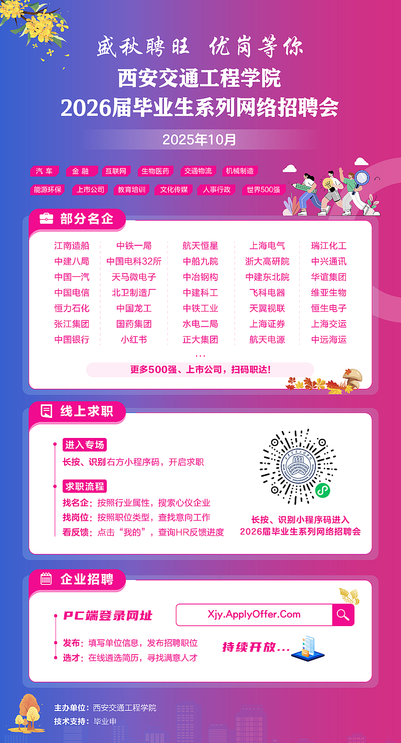 为贯彻落实教育部关于2026届毕业生就业工作的总体部署,落实就业育人工作要求,有效助力我校毕业生高质量充分就业,现决定举办专场线上招聘活动。