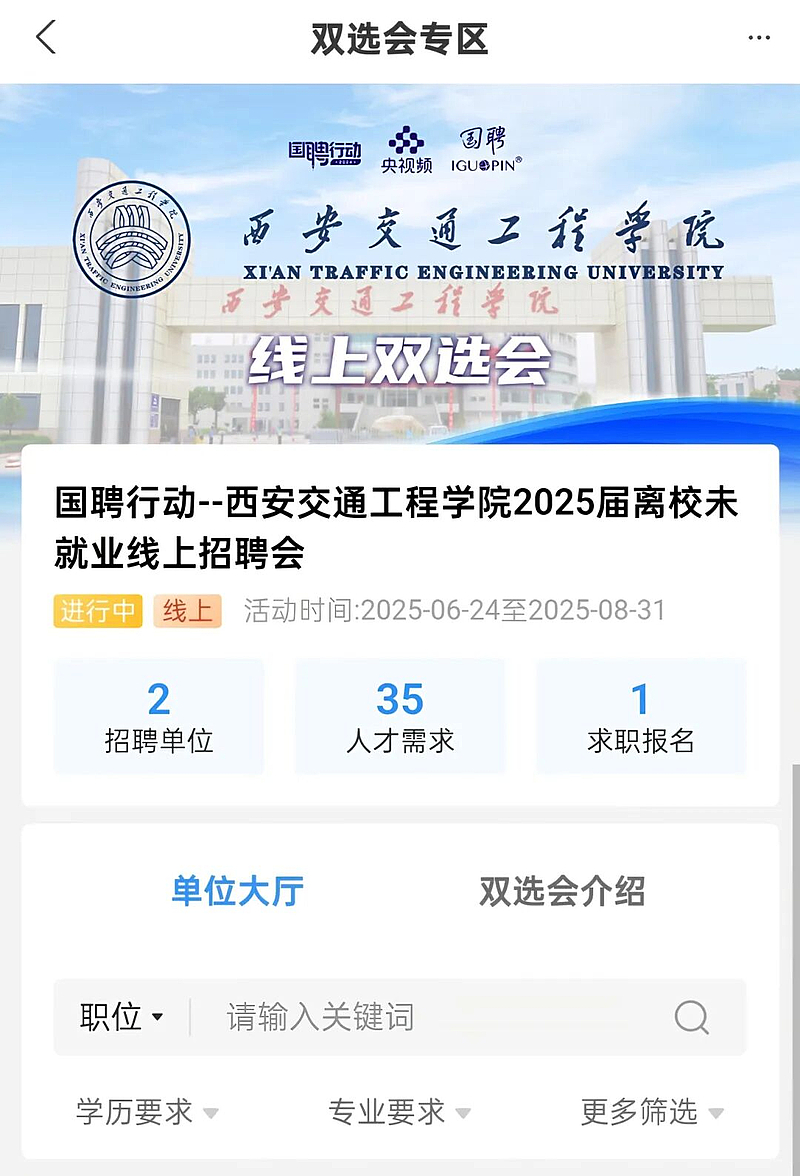 为深入贯彻落实党中央、国务院决策部署,以推动高质量发展为基础,深入实施就业有限战略,充分发挥国有企业就业引领作用和民营企业在稳就业中的重要作用,多措并举扩大就业容量、提升就业质量,促进高校毕业生等重点群体高质量充分就业,我校开展“国聘行动--西安交通工程学院2025届离校未就业线上招聘会”。