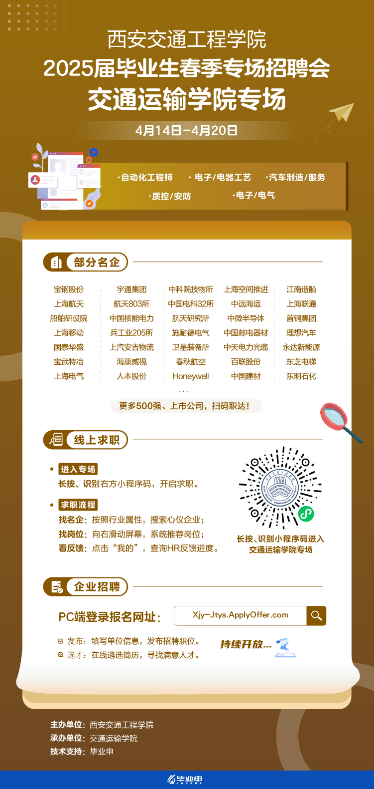 为贯彻落实教育部关于2025届毕业生就业工作的总体部署,深入开展就业育人工作,持续推进毕业生与用人单位精准供需对接,为我校毕业生高质量就业拓宽渠道,现决定举办专场网络招聘活动。