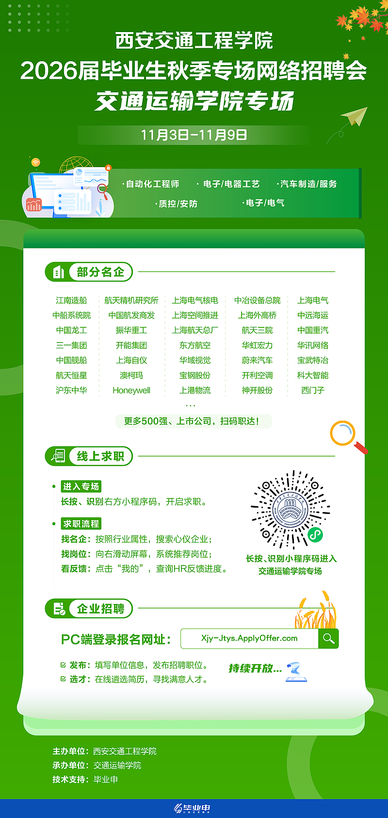 为贯彻落实教育部关于2026届毕业生就业工作的总体部署,深入开展就业育人工作,持续推进毕业生与用人单位精准供需对接,为我校毕业生高质量就业拓宽渠道,现决定举办专场网络招聘活动。