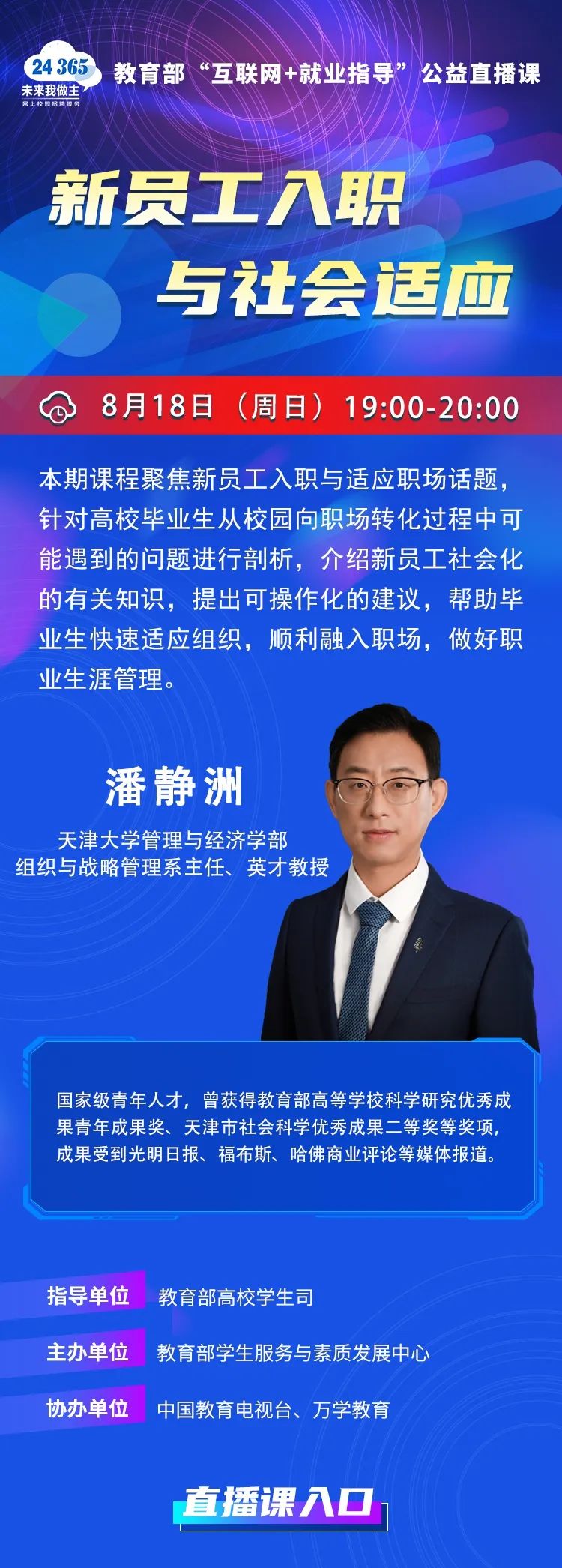 暑期“职”引(13)||课程预告 | 教育部“互联网+就业指导”公益直播课:新员工入职与社会适应