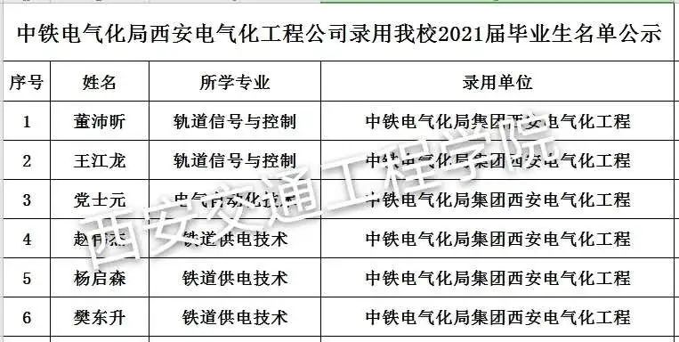 【录用名单】中铁电气化局西安电气化工程公司录用我校2021届毕业生名单公示