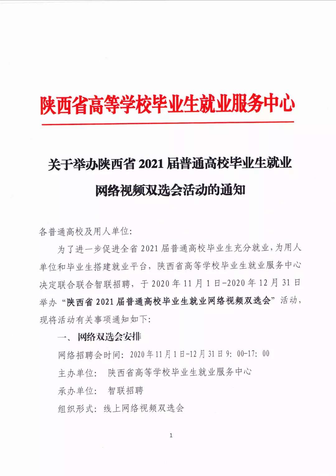关于举办陕西省2021届普通高校毕业生就业网络视频双选会活动的通知