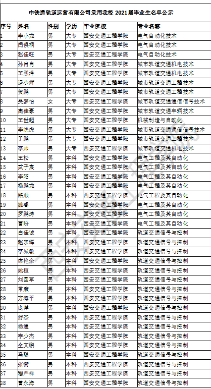 录用名单|中铁通轨道运营有限公司录用我校2021届毕业生名单公示
