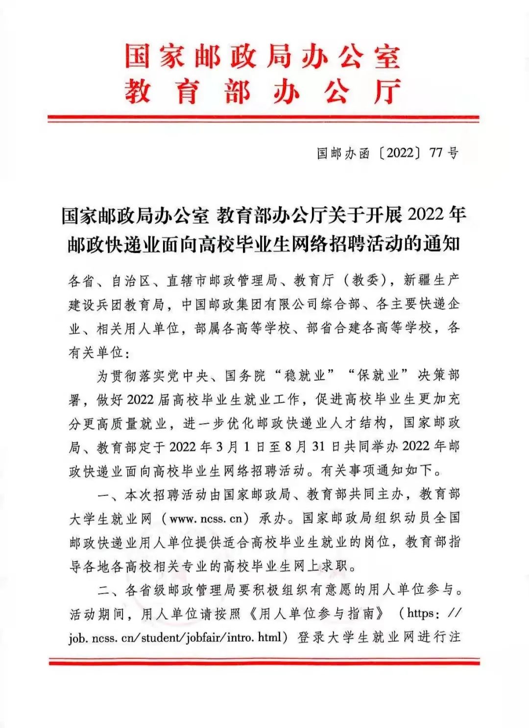 关于开展2022年邮政快递业面向高校毕业生网络招聘活动的通知