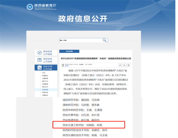 近日,陕西省教育厅公布了2021年度陕西高校思政课教师“大练兵”省级展示活动获奖教师及团队名单,我校马克思主义学院的刘晓航老师及其团队喜获佳绩,荣获思政课团队“思政课教学团队能手”荣誉称号,这是我校首次进入陕西高校思政课教师“大练兵”省级展示决赛并取得佳绩。