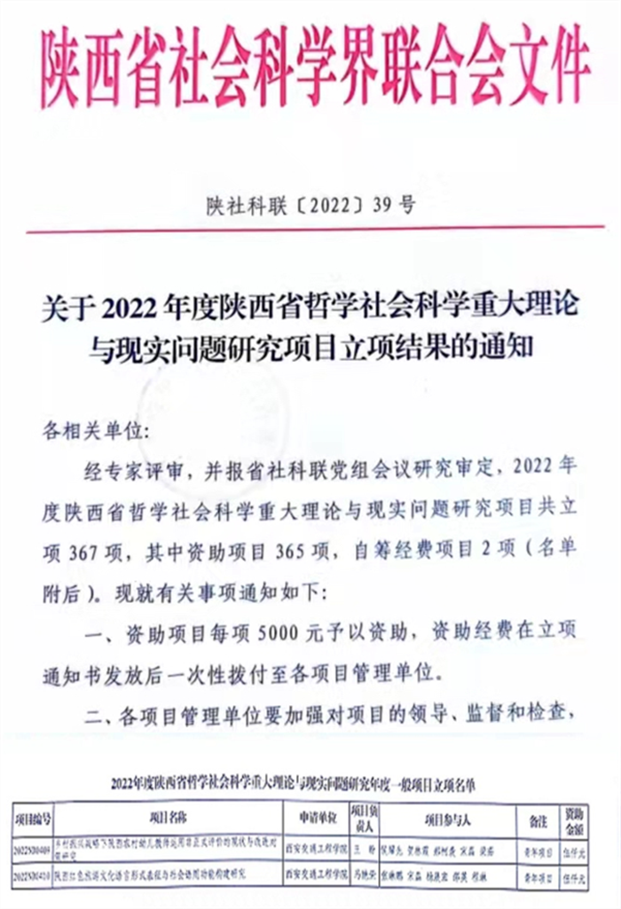 2022年4月29日陕西省社会科学界联合会发布了《关于2022年度陕西省哲学社会科学重大理论与现实问题研究项目立项结果的通知》(陕社科联[2022]39号),我校马艳荣教授主持的《陕西红色旅游文化语言形式表征与社会语用功能构建研究》和王盼讲师主持的《乡村振兴战略下陕西农村幼儿教师运用非正式评价的现状与改进对策研究》获陕西省哲学社会科学重大理论与现实问题研究2022年度一般项目的青年项目资助。
