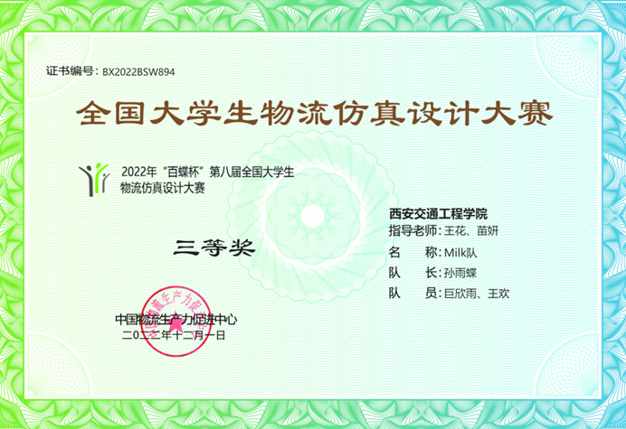 近日,“百蝶杯”第八届全国大学生物流仿真设计大赛圆满结束,大赛由中国物流生产力促进中心主办,上海百蝶教育科技有限公司承办。来自全国共计30个省市自治区的501所院校的895支队伍报名参加本次比赛。经过激烈角逐,在王花老师,苗妍老师指导下,由高明爽,朱小燕,司西西组成的“顺风队”和由孙雨蝶,巨欣雨,王欢组成的“Milk队”获得三等奖2项。