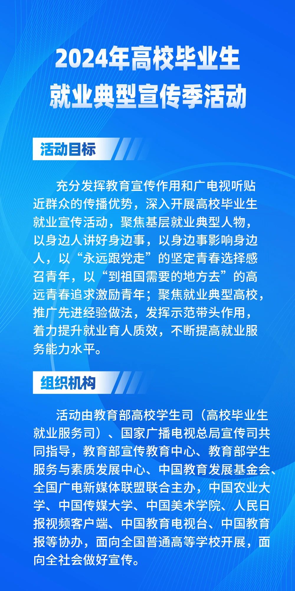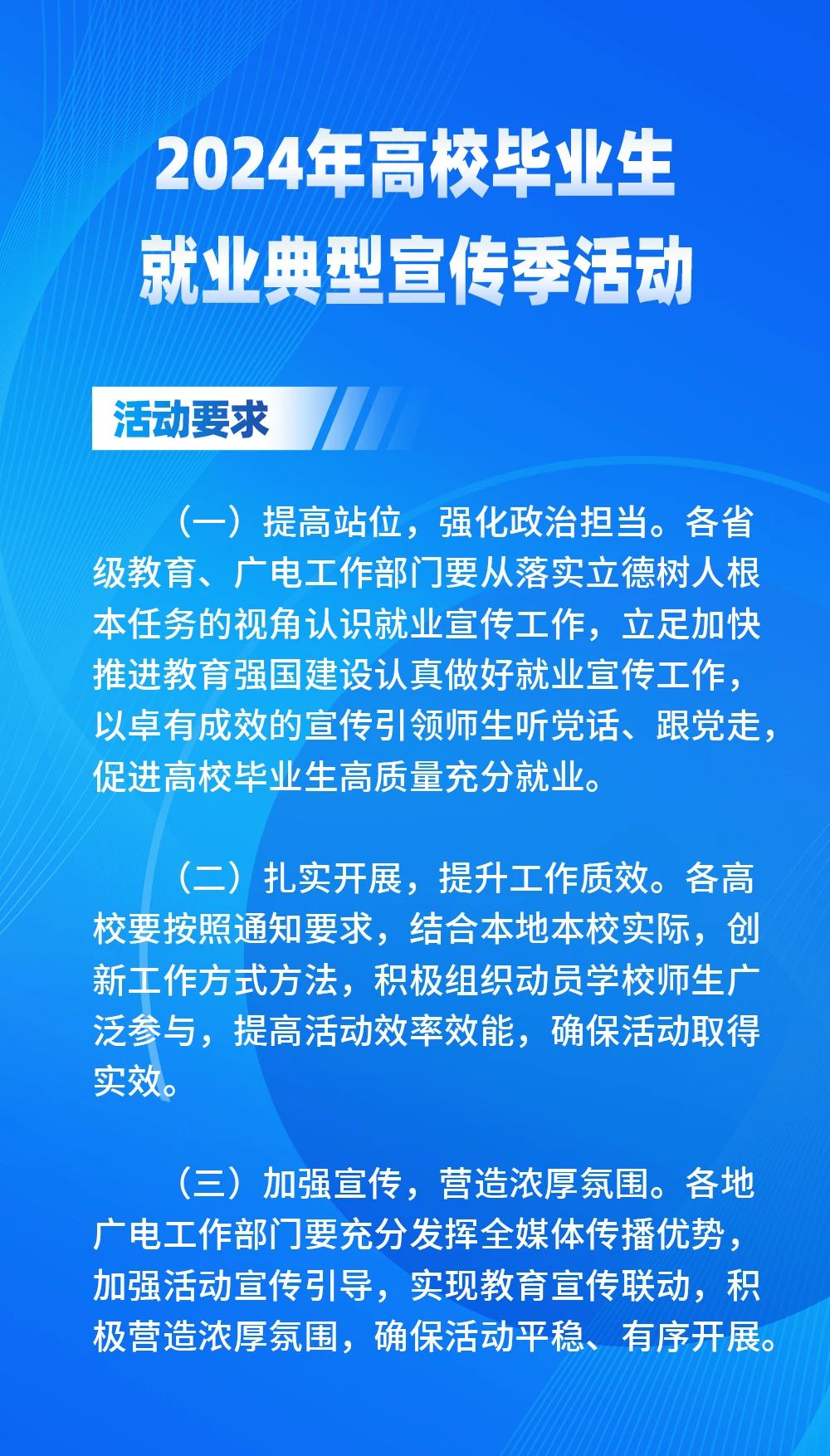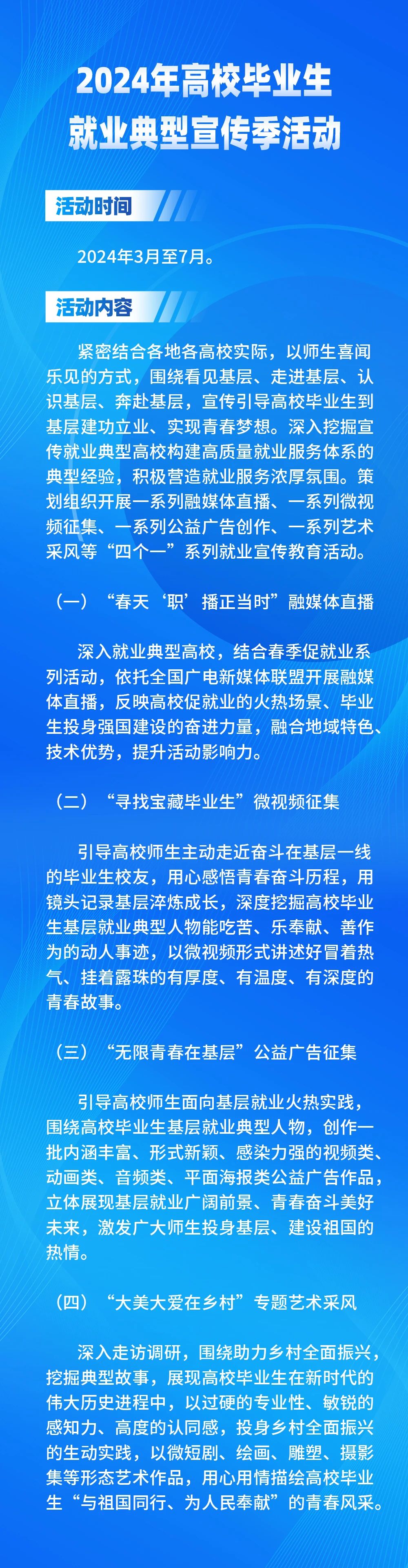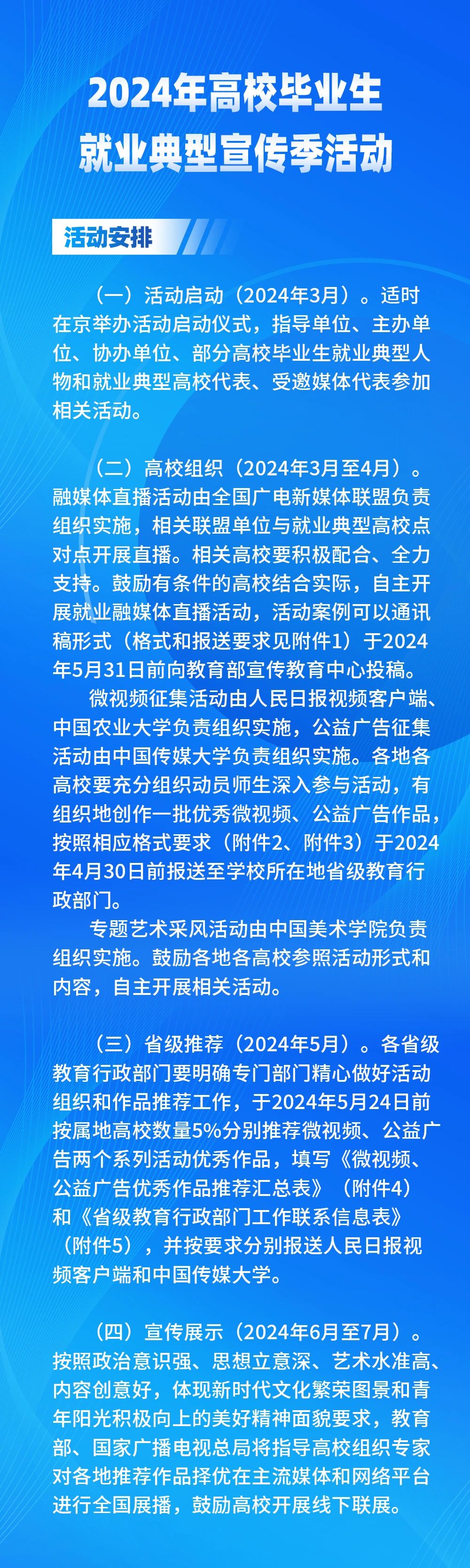 为深入贯彻落实中央经济工作会议和全国宣传思想文化工作会议精神,贯彻落实党中央、国务院对高校毕业生就业工作的决策部署,贯彻2024年全国教育工作会议和全国广播电视工作会议精神,充分宣传展现高校毕业生就业典型人物和就业典型高校风采,全力促进高校毕业生高质量充分就业,教育部和国家广播电视总局决定联合开展2024年高校毕业生就业典型宣传季活动。现将有关事项通知如下。