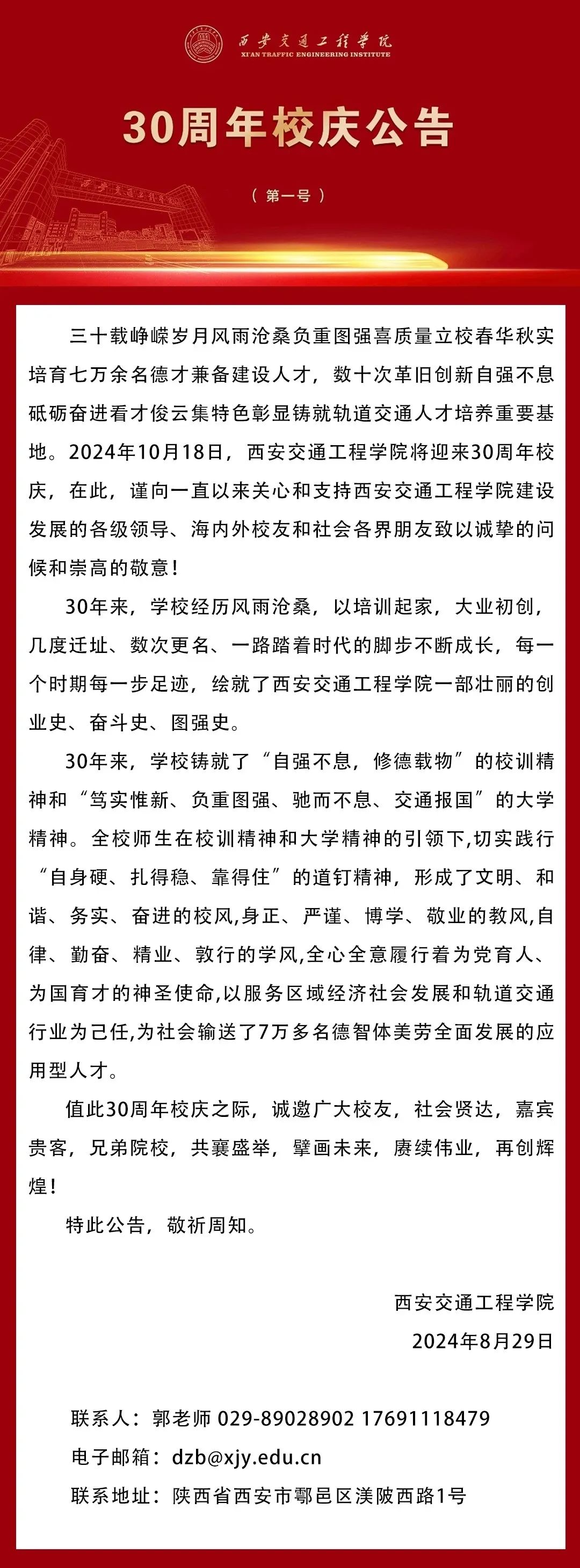 西安交通工程学院30周年校庆公告(第一号)