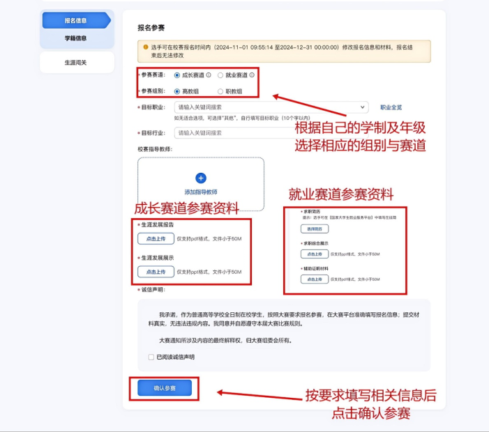 进入报名信息填写界面后,根据自身情况选择参赛赛道及组别。成长赛道和就业赛道分别均设有高教组和职教组,高教组面向本科生,职教组面向专科生。成长赛道参赛对象为在校本、专科低年级学生,就业赛道参赛对象为本、专科高年级在校学生。