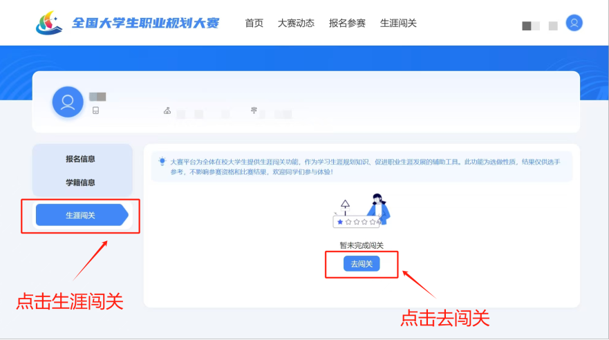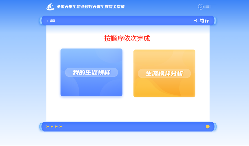 大赛平台还为大家提供了生涯闯关功能,作为学习生涯规划知识、促进职业生涯发展的辅助工具。此功能为选做性质,结果仅供选手参考,不影响参赛资格和比赛结果。