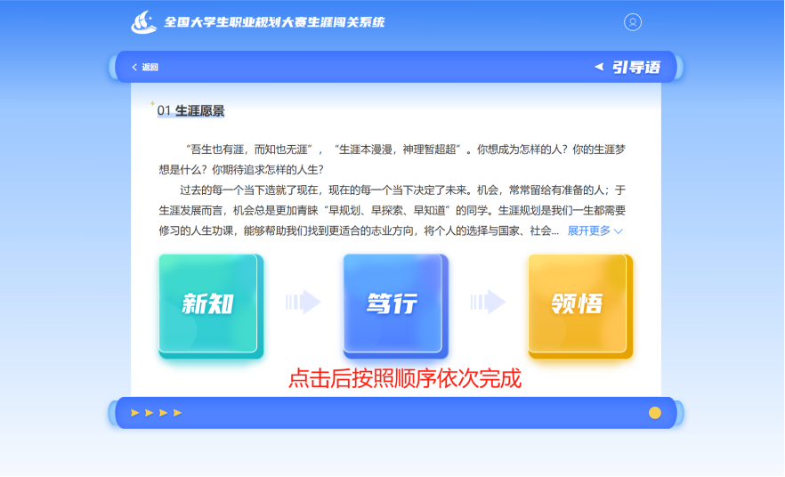 1.点击“生涯愿景”,依次完成闯关任务。