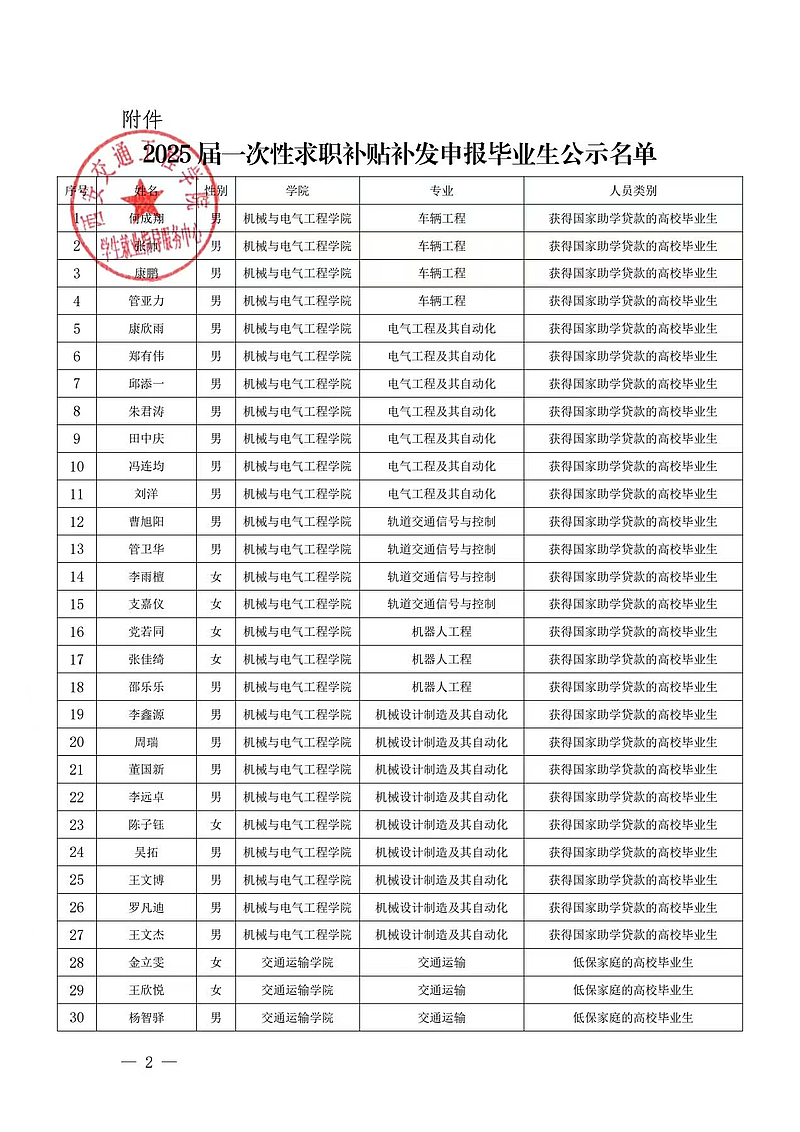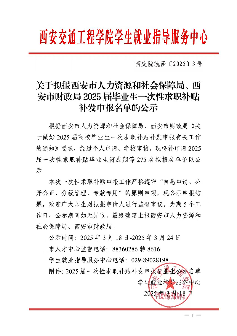 关于拟报西安市人力资源和社会保障局、西安市财政局2025届毕业生一次性求职补贴补发申报名单的公示
