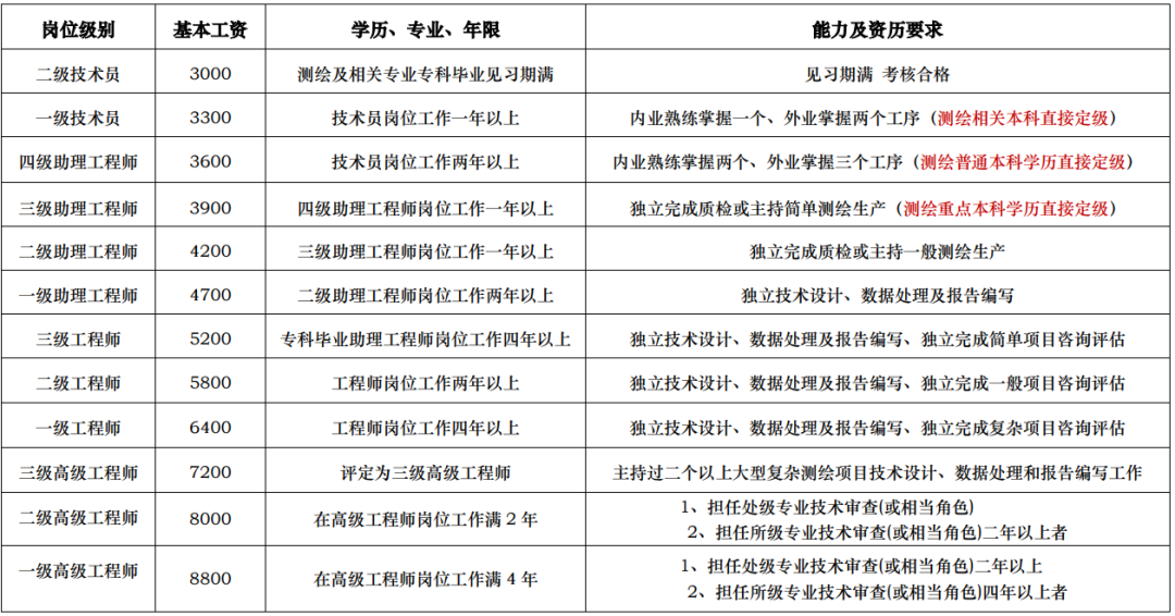 (3)见习期(毕业后)内待遇:毕业之后一年以内为见习期,见习期间测绘及相关专业专科基本工资每月 2600 元。若见习期内全月出工:月工资=基本工资+伙食补助+计件工资+绩效工资(部分) ≈5000~7000 元。(4)定岗之后待遇:见习期满经考核合格后依据专业技术及工作能力进行定岗(技术员、助理工程师、工程师、高级工程师共四级十二档),定岗为二级技术员,基本岗位工资每月 3000 元。定岗第一年月收入:月工资=工龄工资+岗位基本工资+伙食补助+计件工资+绩效工资≈6000~8000 元。年终根据贡献大小发放年终奖。后续每年根据个人所从事岗位、能力及贡献大小情况,岗位级别进行考核后升级。全年总收入约为 80000 元 ~ 250000 元。定岗之后岗位基本工资如下