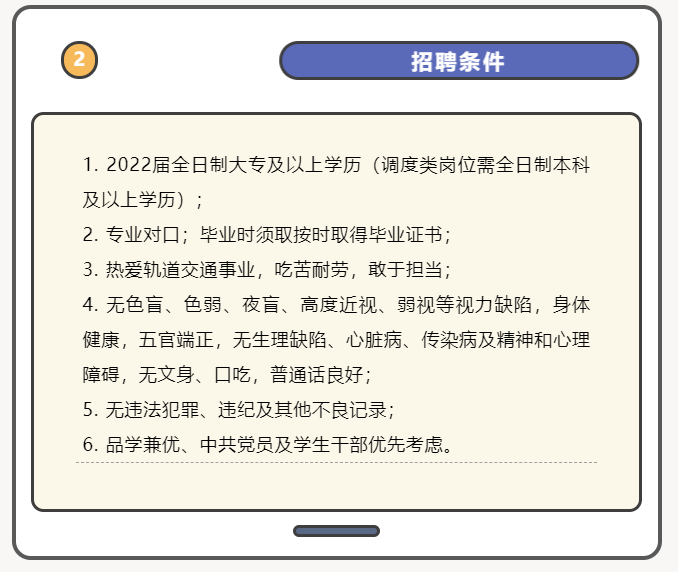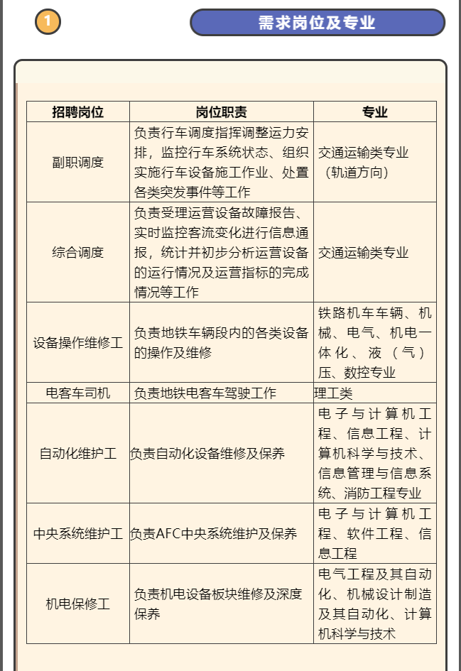 南京地铁运营有限责任公司根据后期新线开通运营需要,现面向全国院校招聘副职调度、综合调度、电客车司机、设备操作维修工、机电保修工等岗位。欢迎符合岗位要求、专业对口、有志于从事地铁运营工作的2022届全日制毕业生报名应聘。现将有关事项公告如下: