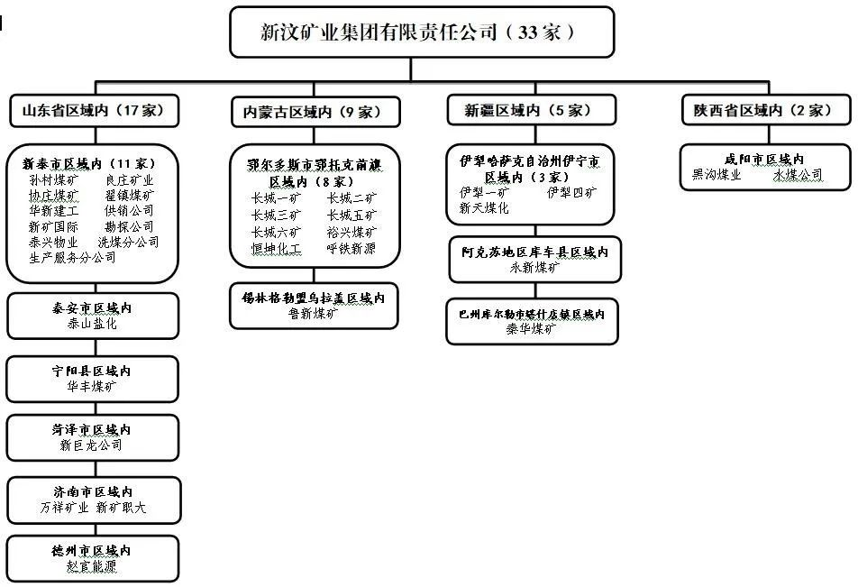 新汶矿业集团有限责任公司为山东省属国有大型集团公司,建企于1956年,总部位于山东省泰安市新泰市,现隶属山东能源集团有限公司(世界500强第70位)。主体产业为煤炭、煤化工、物流贸易、现代服务业。2019年实现营业收入856.18亿元,利润42.01亿元,纳税45.87亿元。截至2019年底,资产总额802.76亿元,在册员工5.1万人,企业信贷信誉AAA级。煤炭产业拥有资源储量205.73亿吨、各类煤矿29对,核定产能5282万吨。新矿集团共有国有独资、国有控参股企业139户,其中二级单位42户,发展地域涉及山东省内的泰安、德州、菏泽等6个地市,省外新疆、内蒙、陕西等7个省区和香港特别行政区。企业先后获得全国“五一”劳动奖状、国家西部大开发突出贡献集体、全国资源综合利用先进单位等荣誉,被评为国家矿产资源综合利用示范基地、第一批循环经济试点企业、山东省文明单位、 “厚道鲁商”品牌企业等。拥有国家级研发中心、煤矿充填开采国家工程实验室以及博士后科研工作站、泰山学者岗位和院士工作站等技术创新平台。