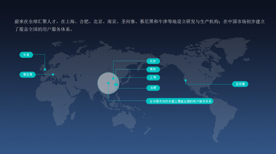 蔚来已在圣何塞、慕尼黑、伦敦、上海等13地设立了研发、设计、生产和商务机构,汇聚了数千名世界顶级的汽车、软件和用户体验的行业人才。