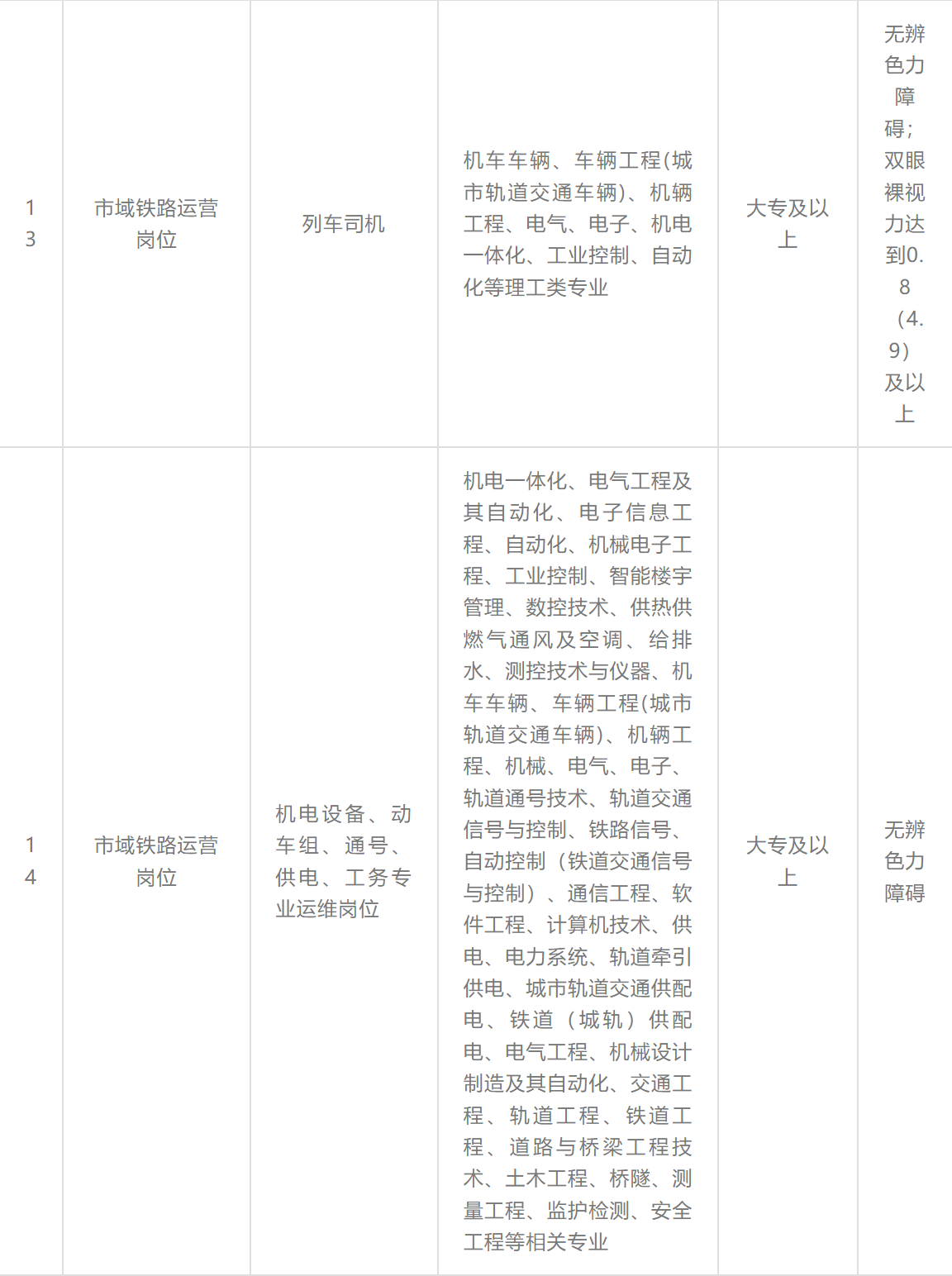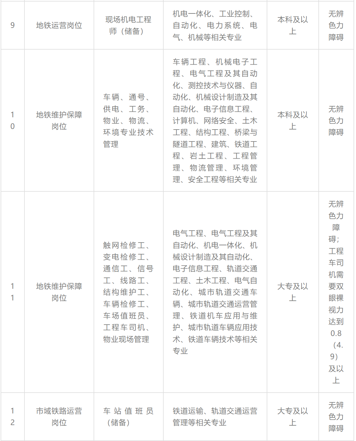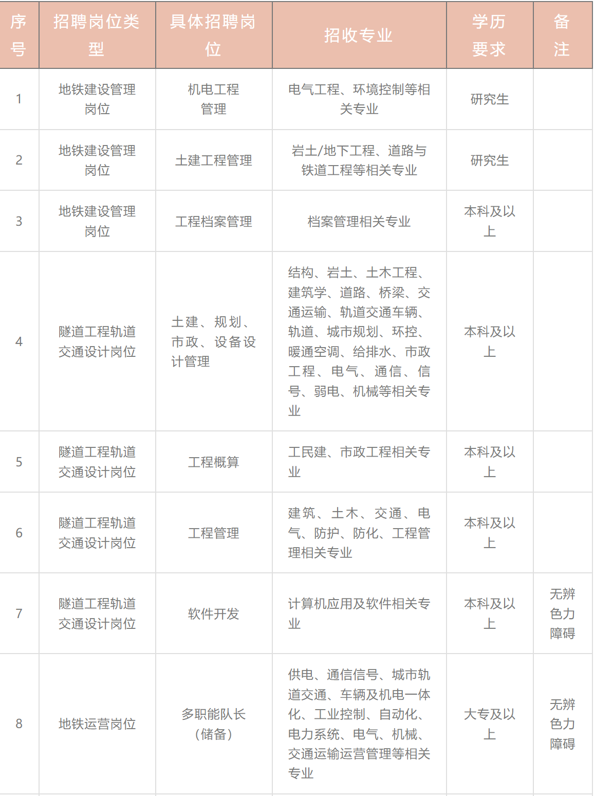 地铁建设管理岗位、地铁运营岗位、地铁维护保障岗位、市域铁路运营岗位、隧道工程轨道交通设计岗位、综合管理等岗位。具体岗位如下表所示:
