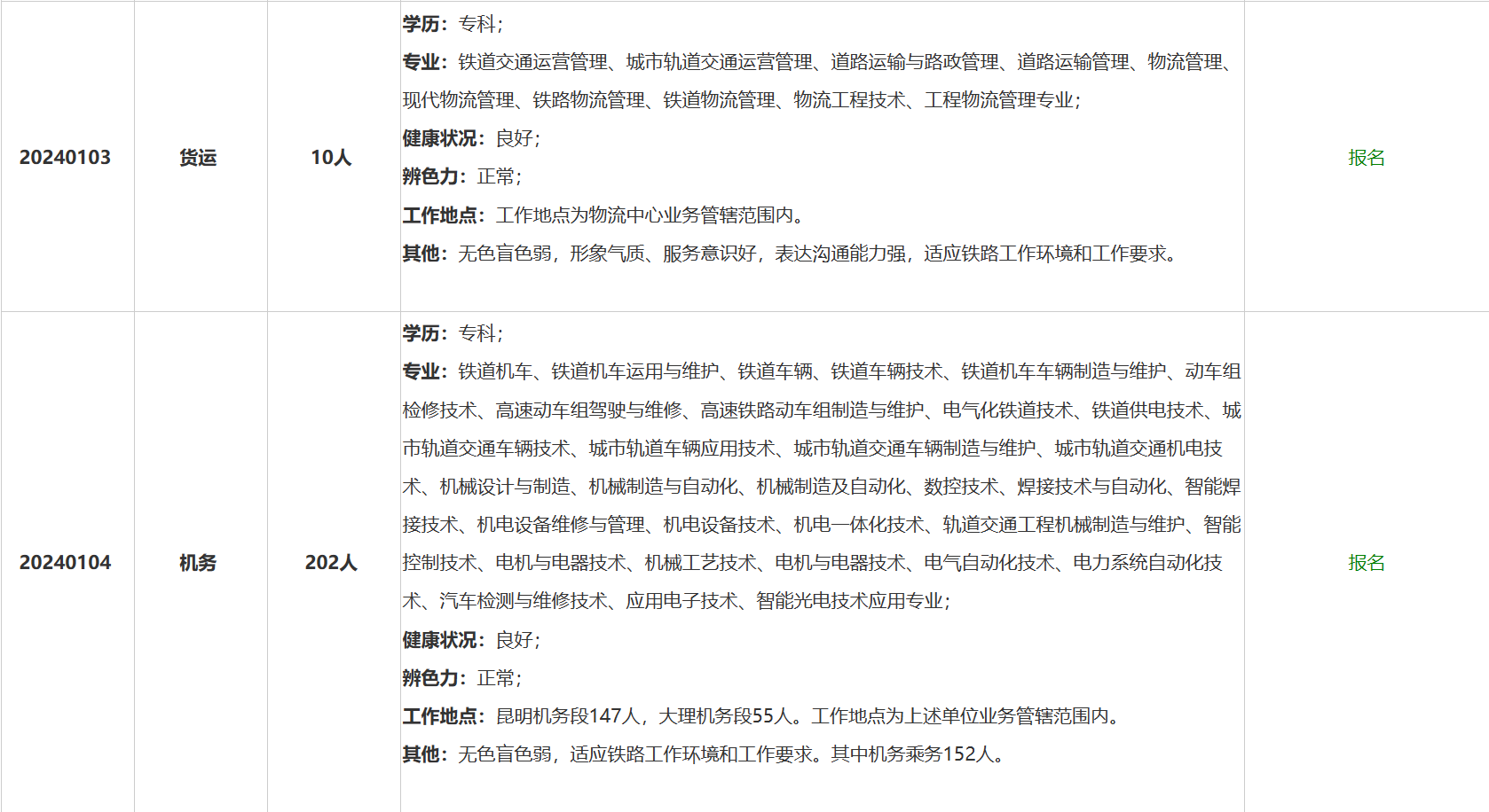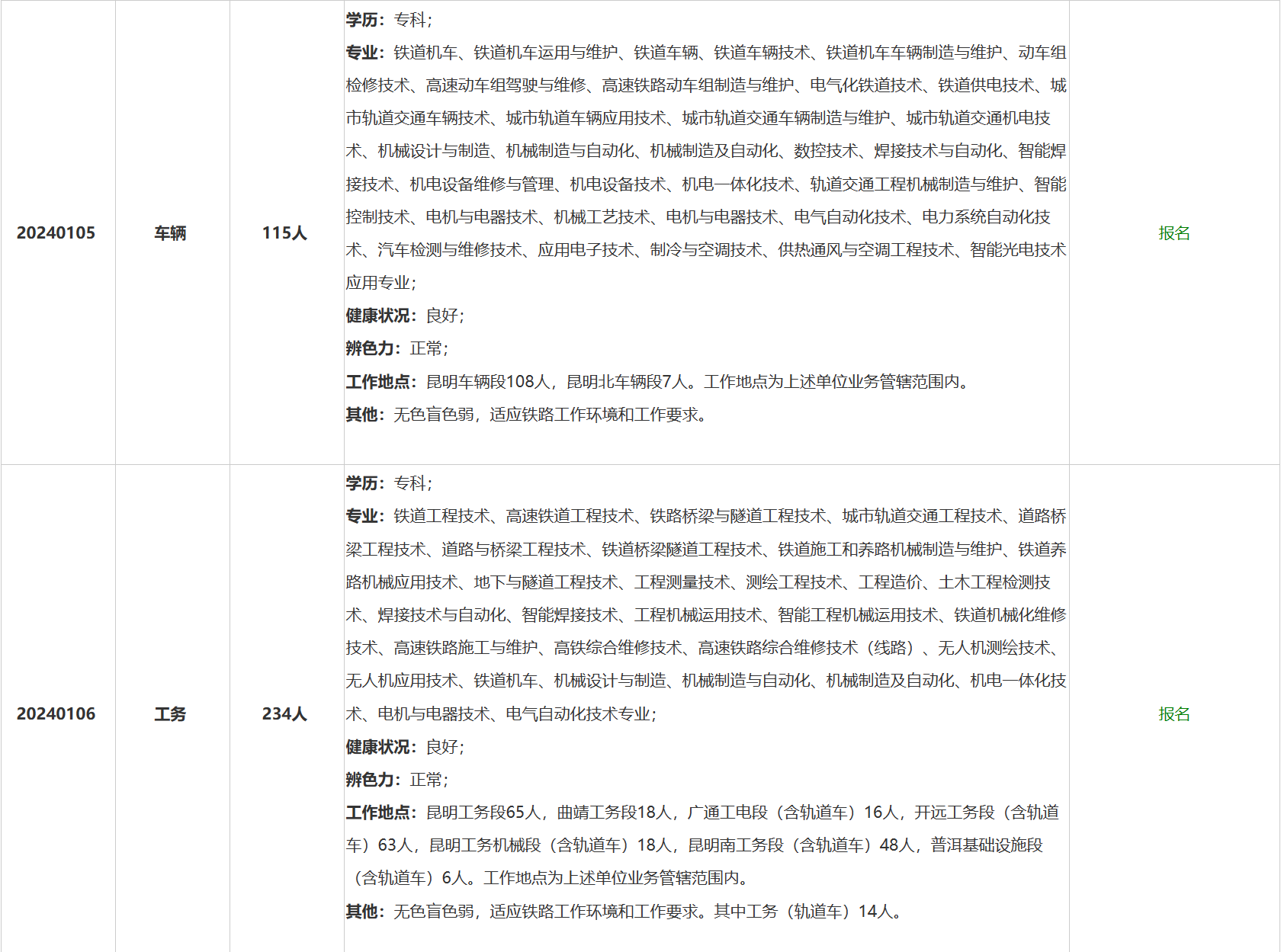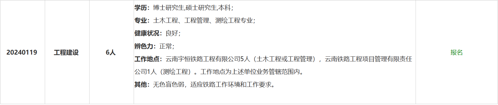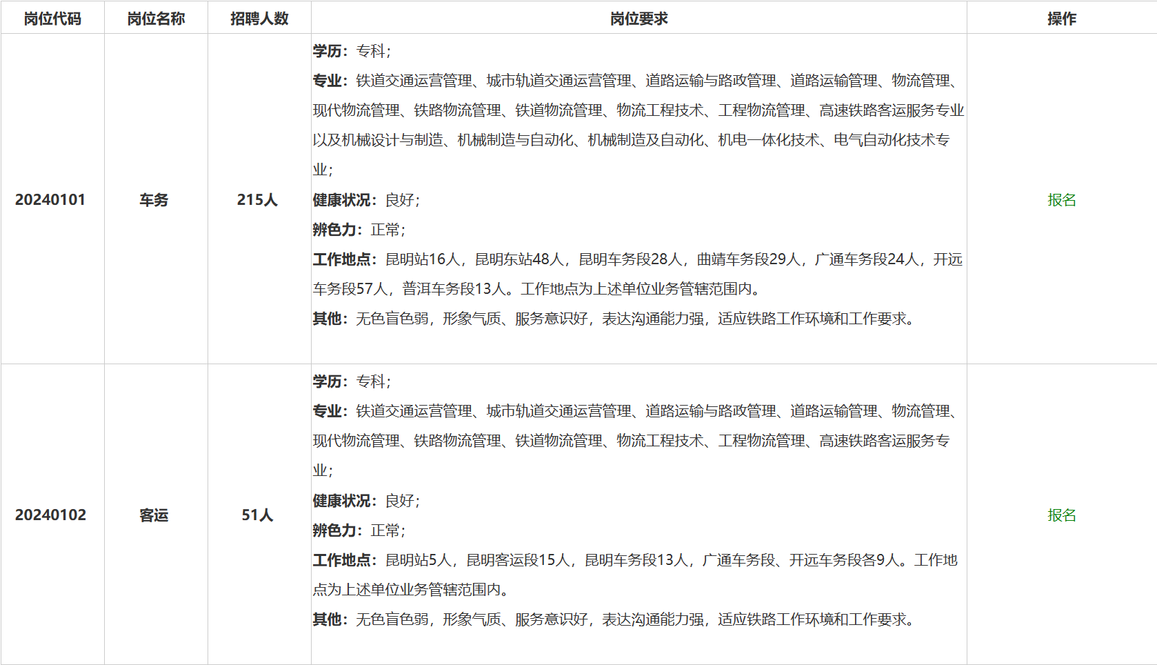 5.服从中国铁路昆明局集团有限公司及所属用人单位对岗位、工作地点的安排和调整,能够适应铁路单位工作环境和岗位工作要求,新录用毕业生原则上安排在运输站段及所属单位生产一线操作技能岗位。