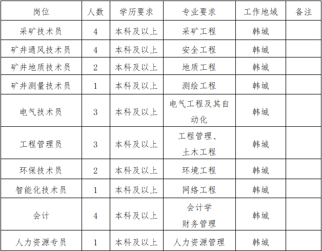 (四)韩城矿业不以任何名义向应聘人员收取报名、培训等费用,请应聘人员提高警惕,谨防受骗。