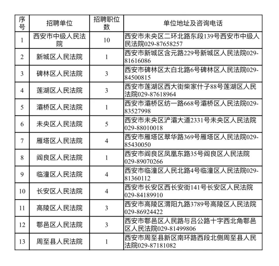 全市法院共招聘聘用制书记员43名,各法院招聘职位、地址及政策咨询电话详见《西安法院2023年面向社会公开招聘聘用制书记员职位表》。