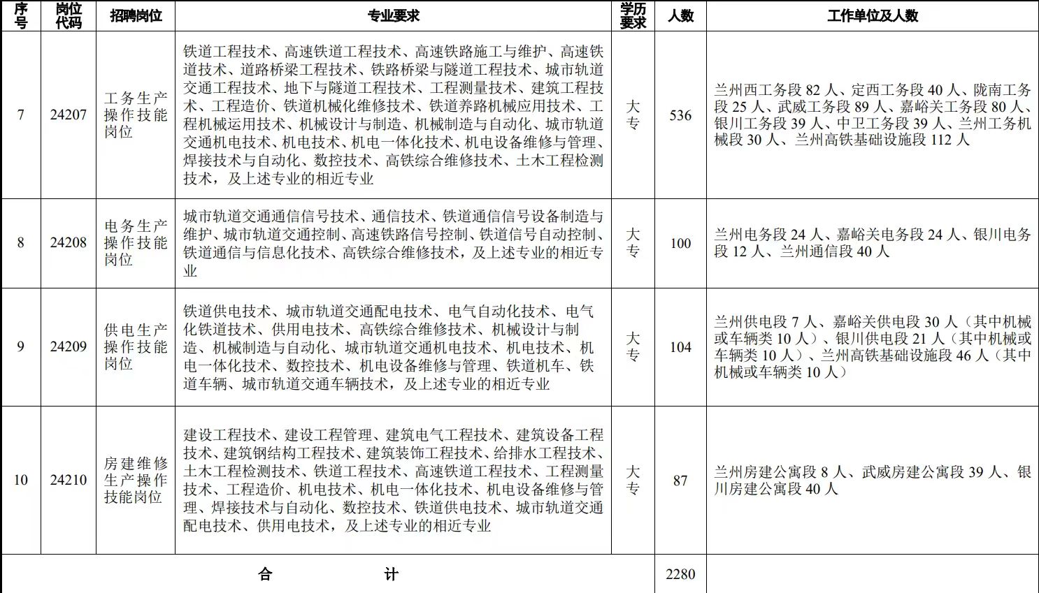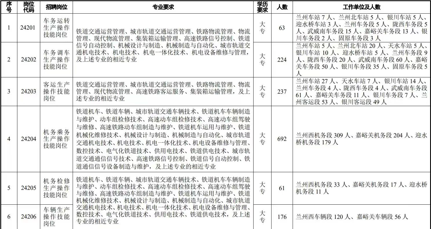 本次计划招聘2280人,招聘岗位均为铁路运输生产一线操作技能岗位,具体岗位、专业、工作单位及招聘人数如下。