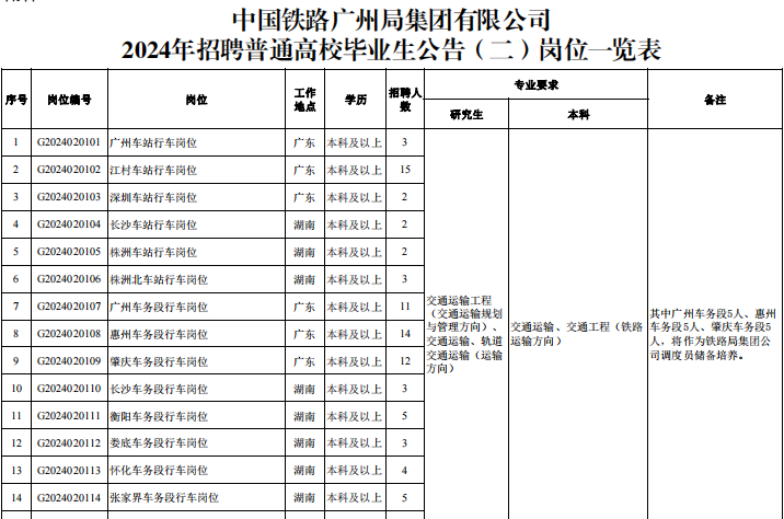 中国铁路广州局集团有限公司根据经营发展需要,拟采取校园招聘方式招聘普通高等院校本科及以上学历毕业生,现将有关事项公告如下: