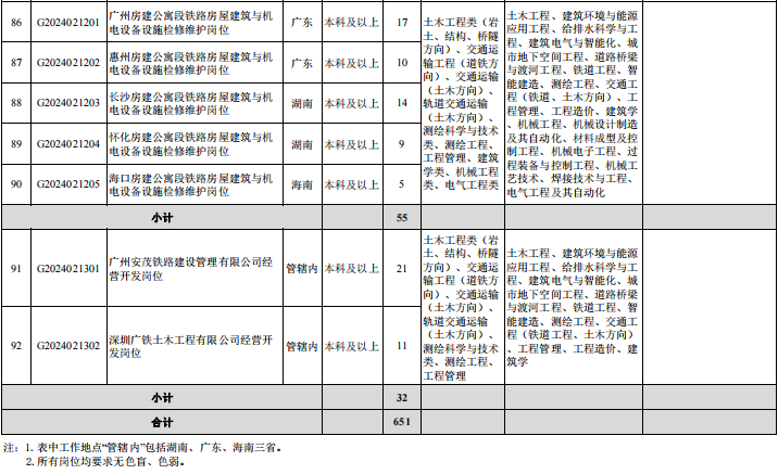 本批次计划招聘651人,招聘岗位、学历、专业要求、人数及工作地点等具体内容如下。本批次新录用毕业生全部按运输生产或经营开发一线操作技能人员引进储备。
