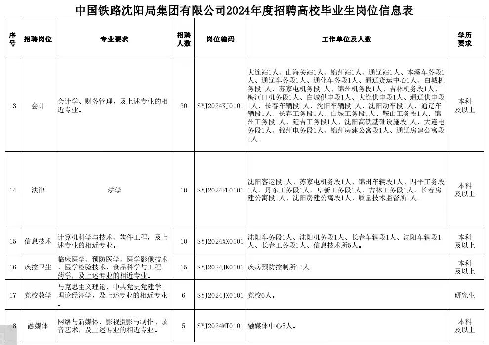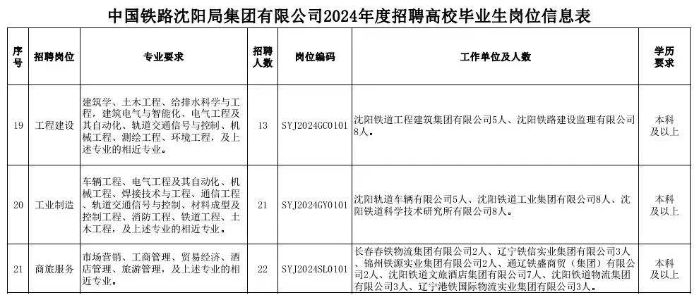 中国铁路沈阳局集团有限公司根据企业发展需要,拟招聘普通高等院校本科及以上学历毕业生,现将有关事项公告如下: