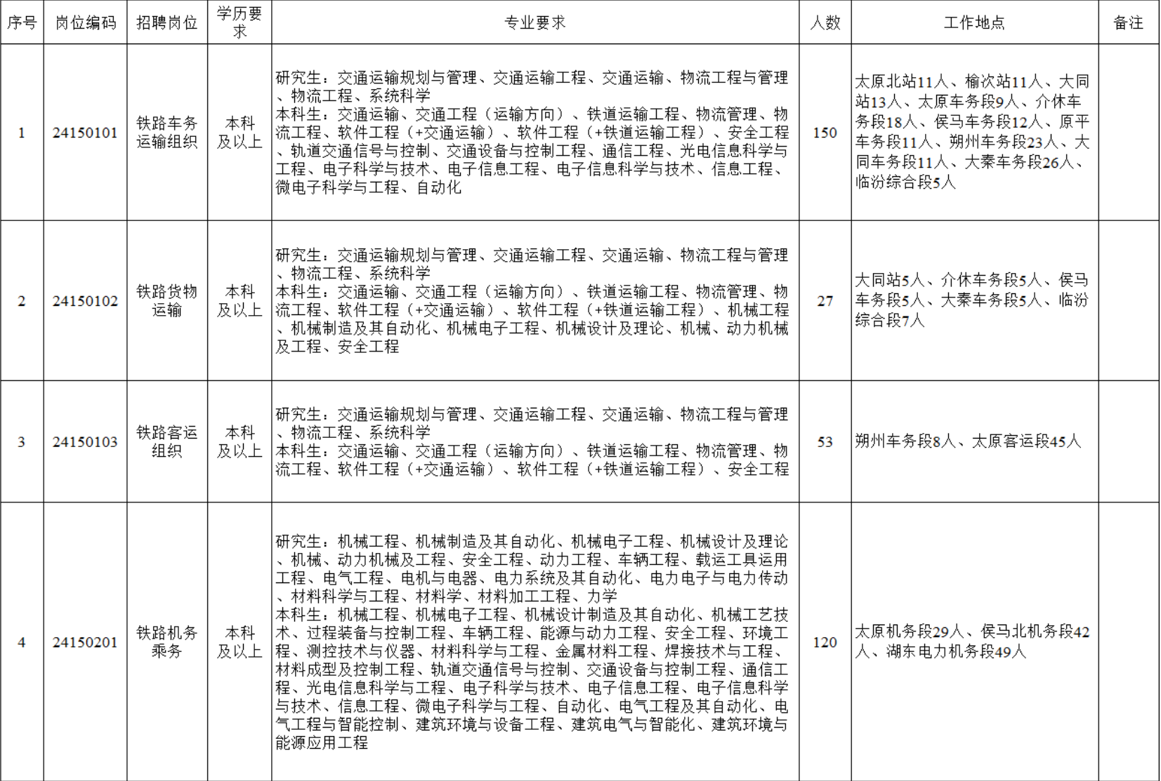 (六)须符合招聘岗位要求的其他条件,服从我公司对岗位的安排和调整,适应长期在铁路沿线、偏远山区、艰苦环境地区工作及户外、野外、轮班、夜班作业要求。应聘运输生产一线岗位的须辨色力正常、双眼矫正视力不低于5.0。