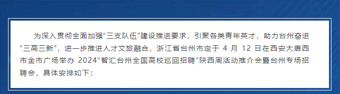 招聘信息||2024“智汇台州全国高校巡回招聘”陕西周活动推介会暨台州专场招聘会