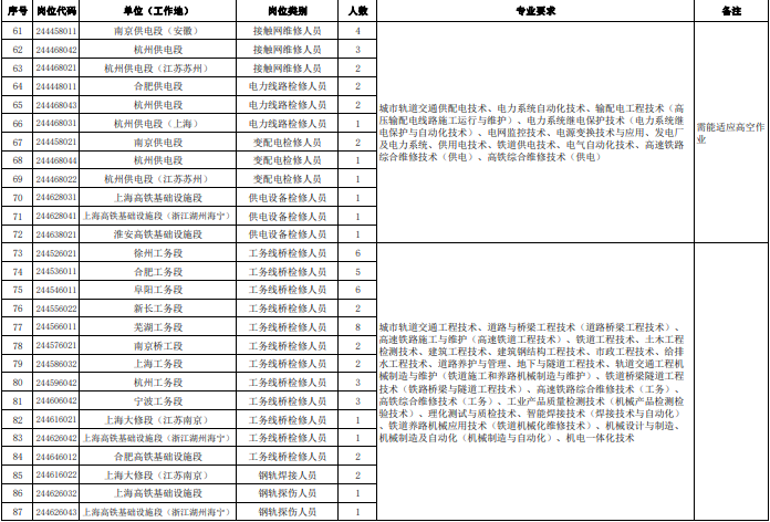 中国铁路上海局集团有限公司根据企业发展需要,拟招聘应届全日制普通高等职业院校高职(大专)毕业生,现将具体事项公告如下:
